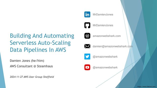 Jones (he/him) AWS Consultant @ Steamhaus 2024-11-27 AWS User Group Sheffield @amazonwebshark MrDamienJones amazonwebshark.com [email protected] MrDamienJones https://www.flaticon.com/ @amazonwebshark