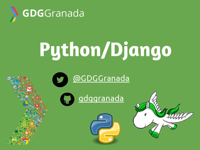 Desarrollo rápido y limpio • Mapea objetos python con la base de datos (ORM) • Servidor local de desarrollo • Permite diseñar URLs elegantes • Sistema de plantillas sencillo para diseñadores • Puede gestionar formularios, sesiones de usuarios, sitemaps, autenticación, caché, internalización, etc. GDGGranada