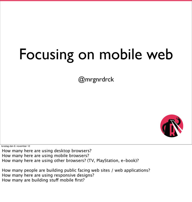 How many here are using desktop browsers? How many here are using mobile browsers? How many here are using other browsers? (TV, PlayStation, e-book)? How many people are building public facing web sites / web applications? How many here are using responsive designs? How many are building stuff mobile first?