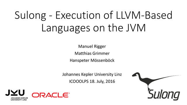 the JVM." Proceedings of the Third Workshop on Virtual Machines and Intermediate Languages. ACM, 2009. [2] Würthinger, Thomas, et al. "One VM to rule them all." Proceedings of the 2013 ACM international symposium on New ideas, new paradigms, and reflections on programming & software. ACM, 2013. [3] Lattner, Chris, and Vikram Adve. "LLVM: A compilation framework for lifelong program analysis & transformation." Code Generation and Optimization, 2004. CGO 2004. International Symposium on. IEEE, 2004. [4] Grimmer, Matthias, et al. "High-performance cross-language interoperability in a multi-language runtime." Proceedings of the 11th Symposium on Dynamic Languages. ACM, 2015. [5] Grimmer, Matthias, et al. "Dynamically composing languages in a modular way: supporting C extensions for dynamic languages." Proceedings of the 14th International Conference on Modularity. ACM, 2015. [6] Szekeres, Laszlo, et al. "Sok: Eternal war in memory." Security and Privacy (SP), 2013 IEEE Symposium on. IEEE, 2013. 26