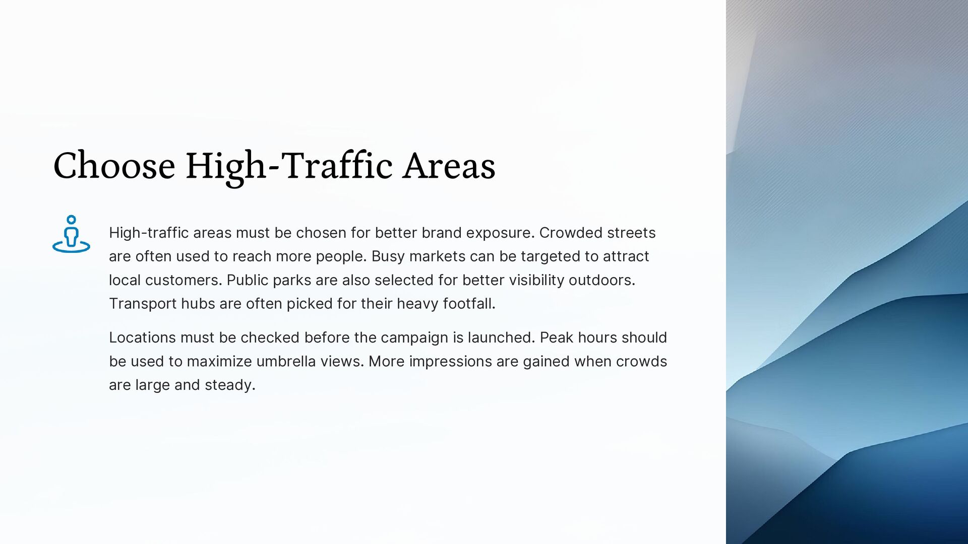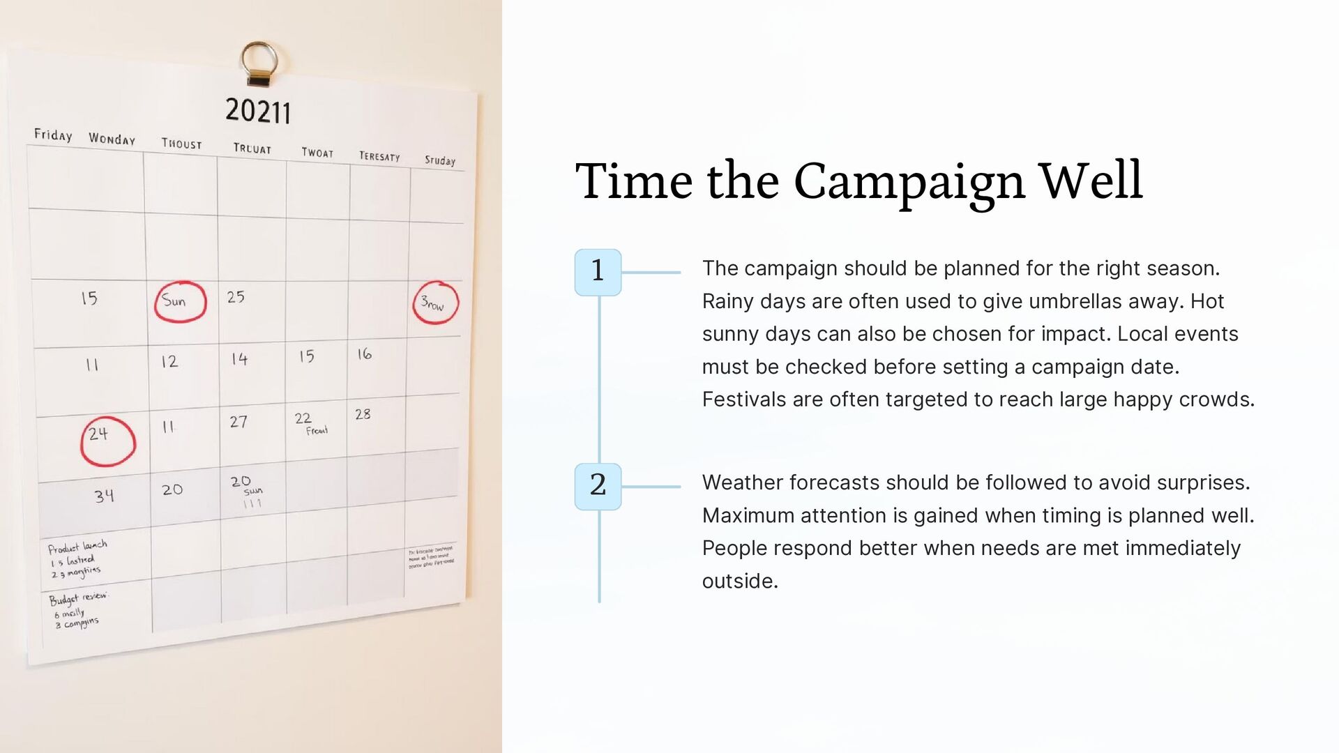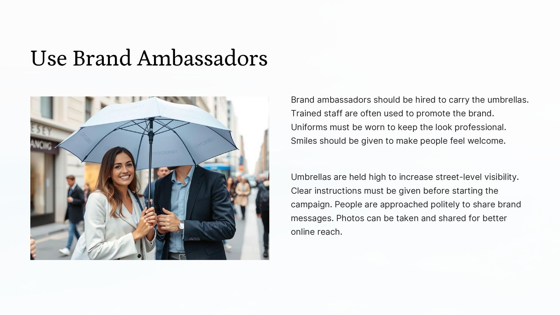 Umbrellas can be used to catch attention on busy streets. Messages and logos are often printed on their wide surfaces. In crowded areas, umbrellas are easily seen by many people. A street-level campaign can be launched with little cost.