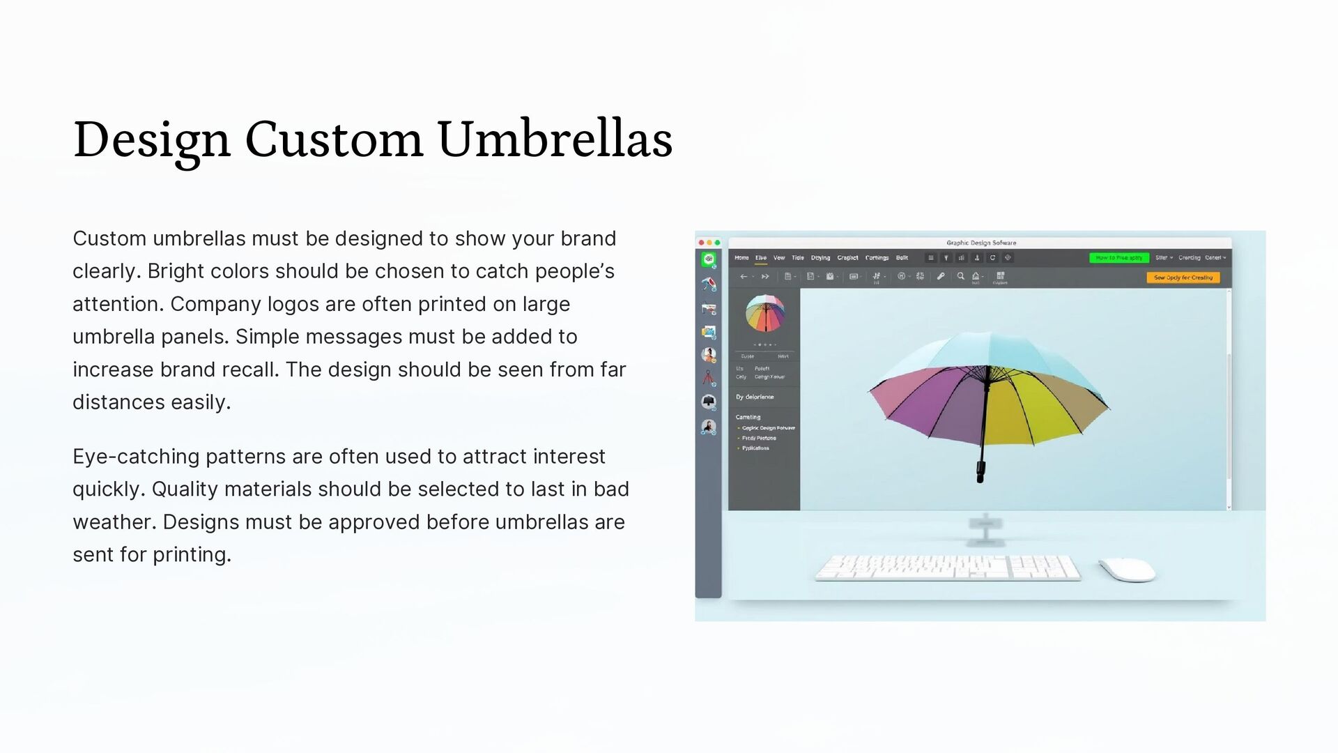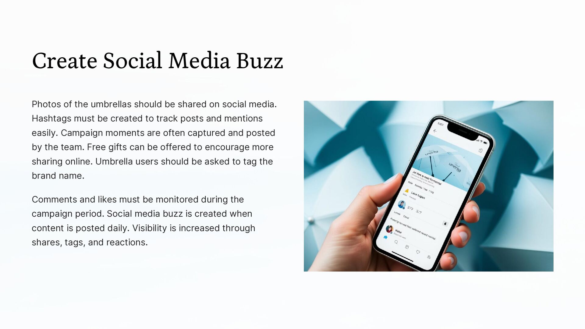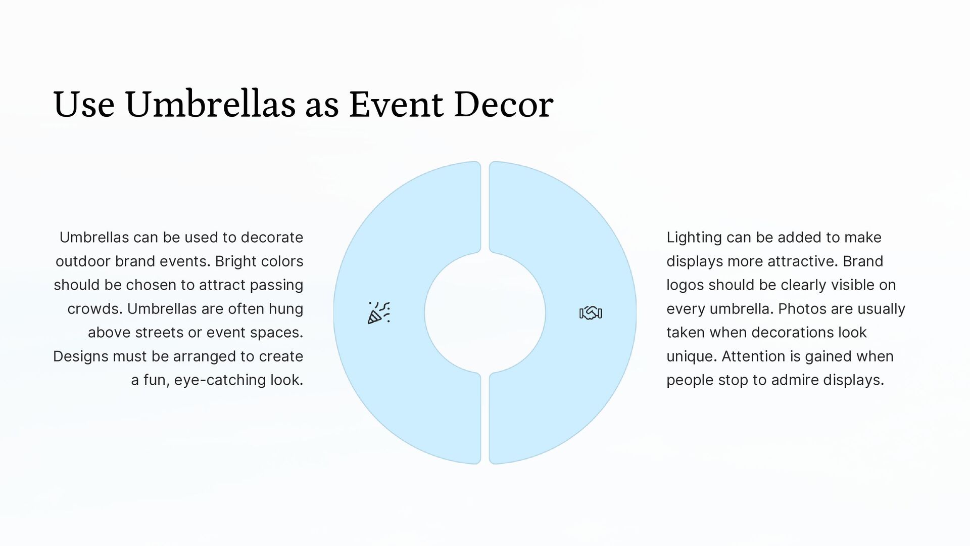 Umbrellas can be used to catch attention on busy streets. Messages and logos are often printed on their wide surfaces. In crowded areas, umbrellas are easily seen by many people. A street-level campaign can be launched with little cost.