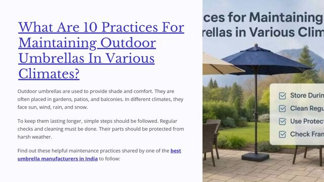 Outdoor umbrellas are used to provide shade and comfort. They are often placed in gardens, patios, and balconies. In different climates, they face sun, wind, rain, and snow. find out these helpful maintenance practices shared by one of the best umbrella manufacturers in India to follow: