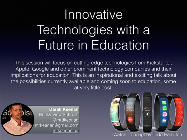 This session focuses on cutting edge technologies from Kickstarter, Apple, Google and other prominent technology companies and their implications for education. This is an inspirational and exciting talk about the possibilities currently available and coming soon to education, some at very little cost!