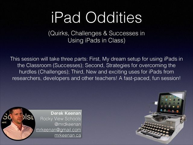This session is in three parts: First, My dream setup for using iPads in the Classroom (Successes); Second, Strategies for overcoming the hurdles (Challenges); Third, New and exciting uses for iPads from researchers, developers and other teachers! A fast-paced, fun session!