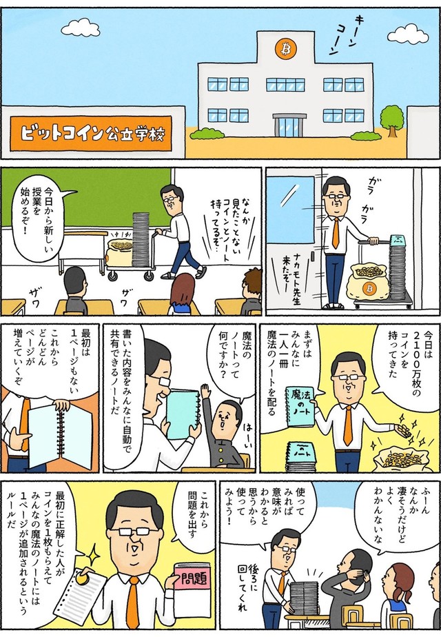 ビットコイン公立学校の授業という例で、仮想通貨の仕組みを漫画で説明します。