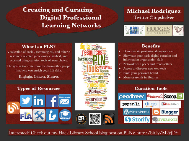 Networks What is a PLN? A collection of social, technological, and other e- resources selected judiciously, classified, and accessed using curation tools of your choice. The goal is to curate resources from other people that help you enrich your LIS skills. Engage. Learn. Share. Benefits Ø Demonstrate professional engagement Ø Showcase your basic digital curation and information organization skills Ø Network with peers and trend-setters Ø Access or discover new web tools Ø Build your personal brand Ø Monitor trends in libraries Tools Curation Tools Interested? Check out my Hack Library School blog post on PLNs: http://bit.ly/M2yjDY Types of Resources