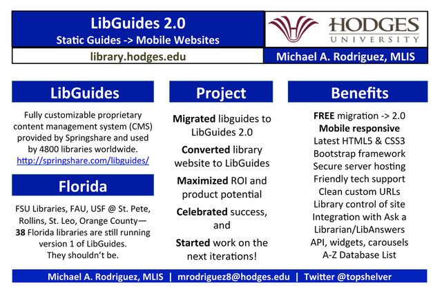 Poster session at the Florida Library Association (FLA) Annual Conference, Orlando, FL, May 14, 2015. This double poster addressed Hodges University's migration from LibGuides 1.0 and the transformative integration of the entire library website into LibGuides 2.0 CMS.