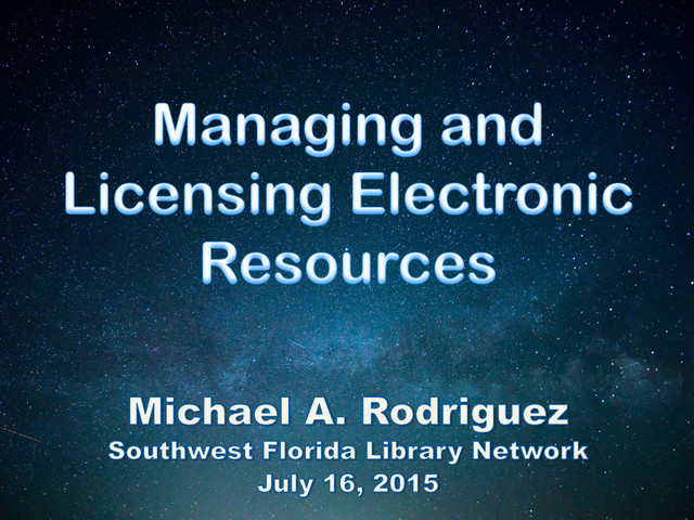 Paid webinar sponsored by the Southwest Florida Library Network (SWFLN) to educate Florida librarians on electronic resource management (ERM) and digital licensing, July 16, 2015