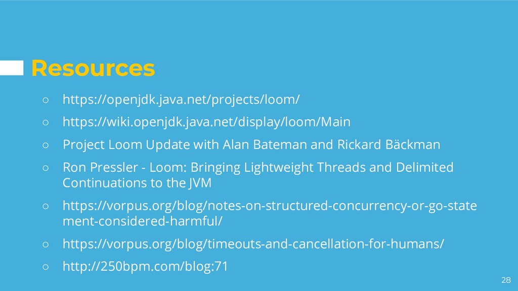 with Alan Bateman and Rickard Bäckman ◦ Ron Pressler - Loom: Bringing Lightweight Threads and Delimited Continuations to the JVM ◦ https://vorpus.org/blog/notes-on-structured-concurrency-or-go-state ment-considered-harmful/ ◦ https://vorpus.org/blog/timeouts-and-cancellation-for-humans/ ◦ http://250bpm.com/blog:71