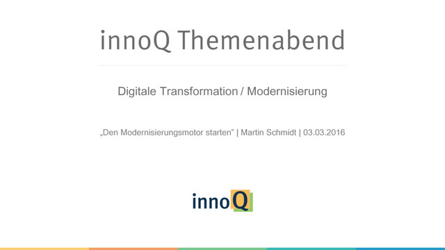 > Finanzen/Versicherung > Seit 2009 bei innoQ > Themenschwerpunkt heute: Modernisierung Martin Schmidt Principal Consultant Extended Management Board [email protected]