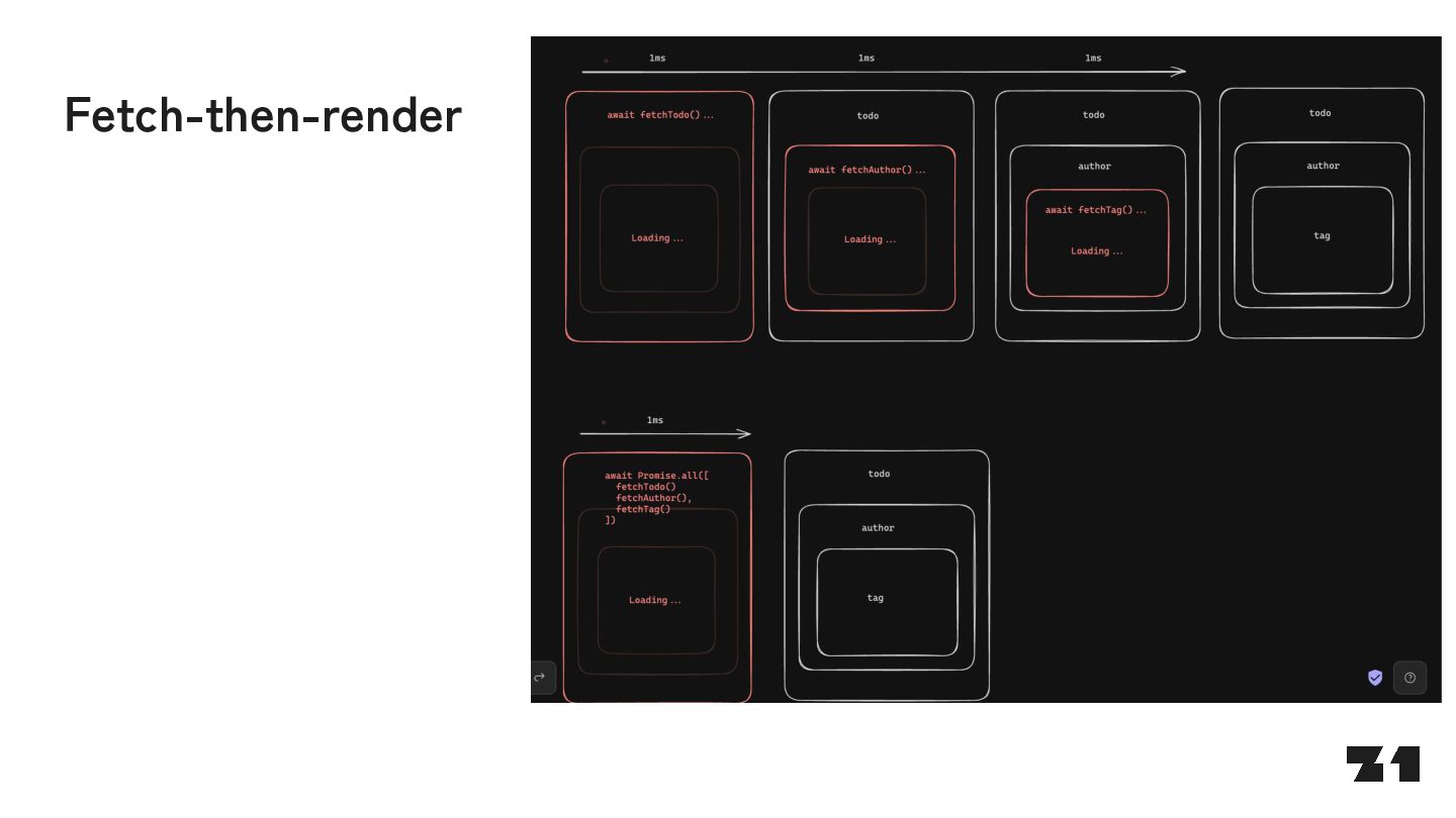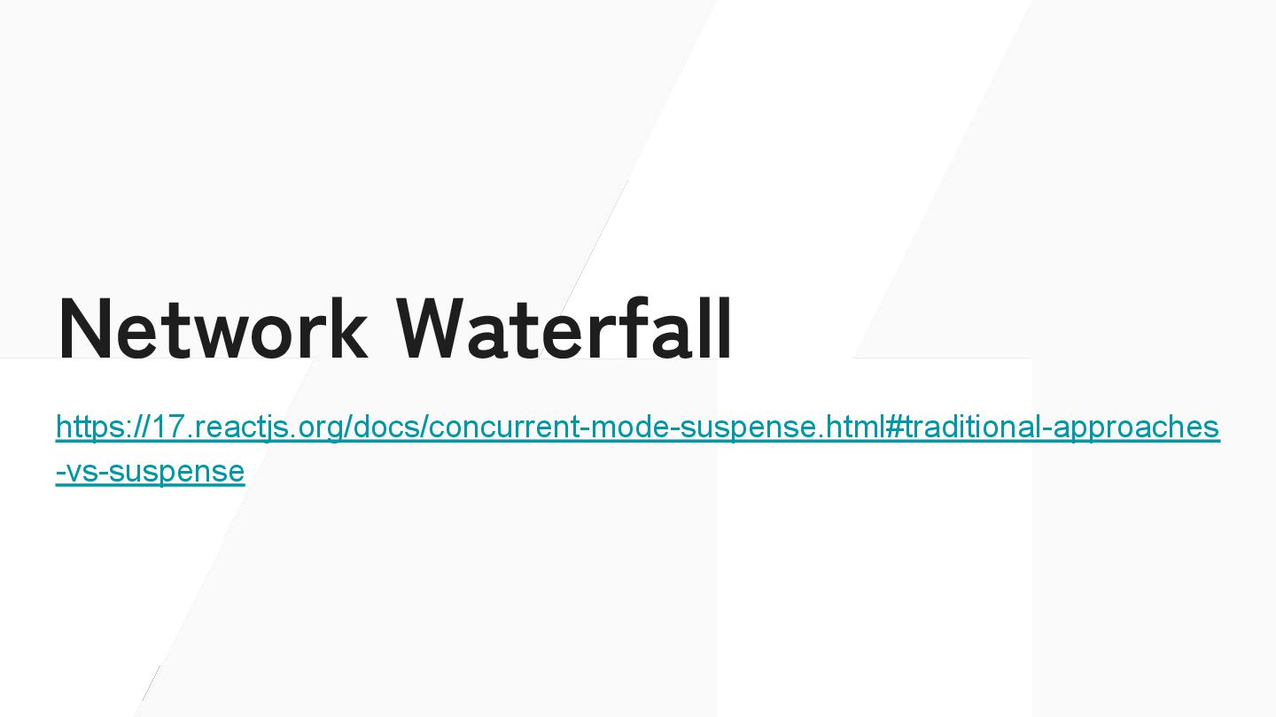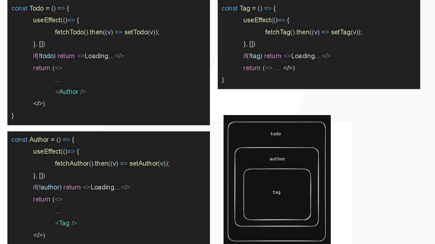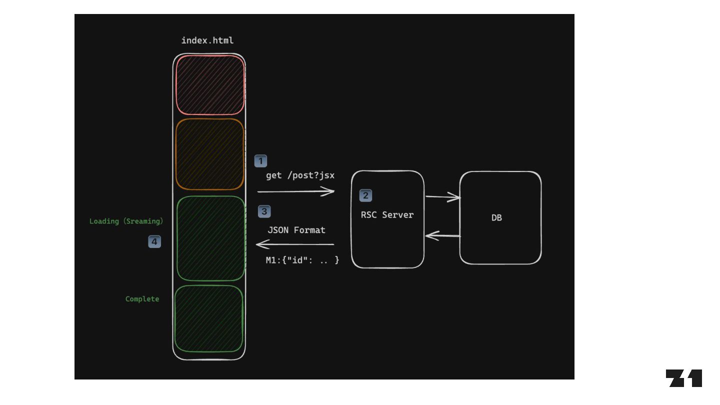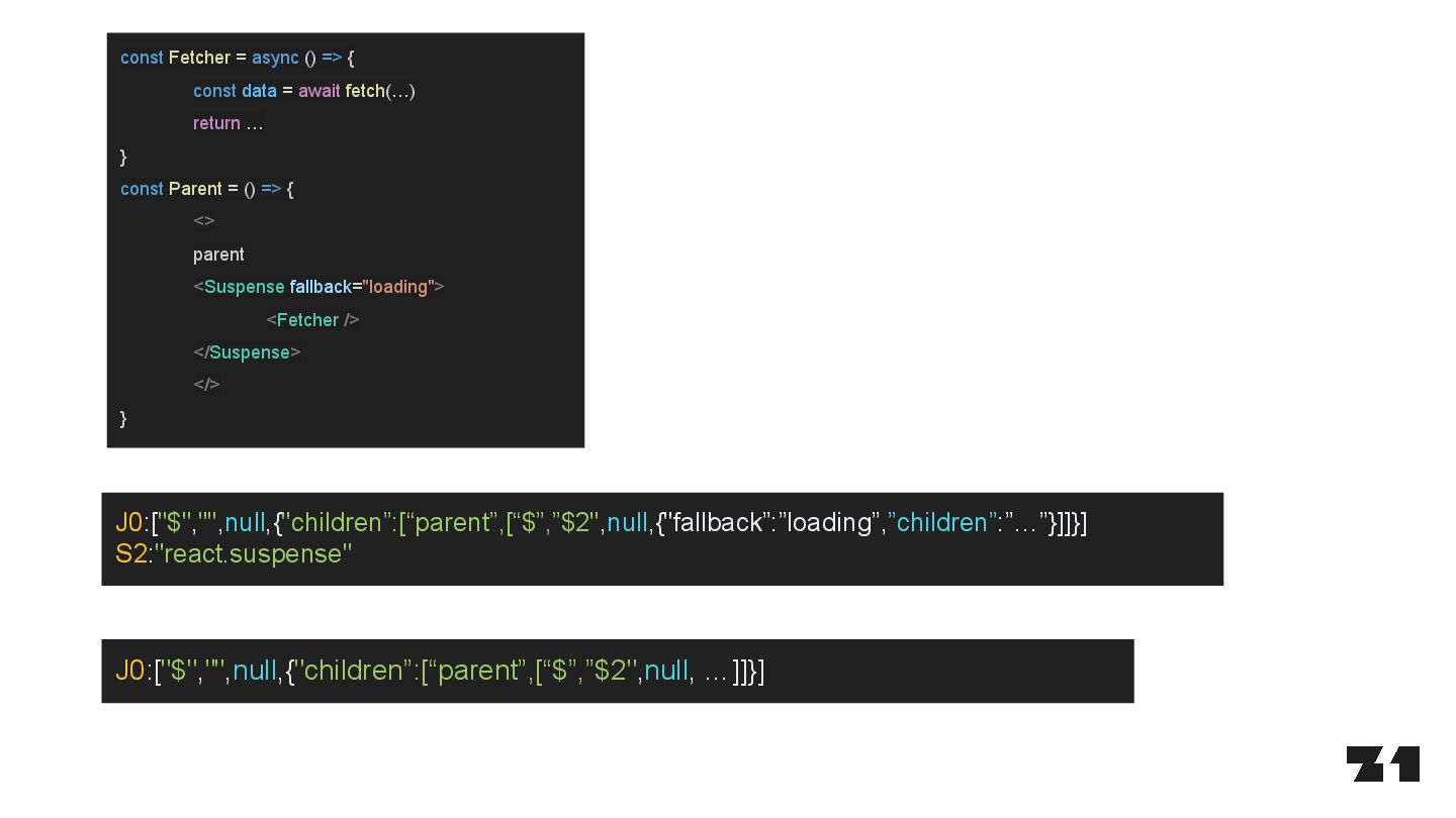await fetch(…) return … } const Parent = () => { <> parent <Suspense fallback="loading"> <Fetcher /> </Suspense> </> } J0:["$","",null,{"children”:[“parent”,[“$”,”$2",null,{"fallback”:”loading”,”children”:”…”}]]}] S2:"react.suspense" J0:["$","",null,{"children”:[“parent”,[“$”,”$2",null, …]]}]