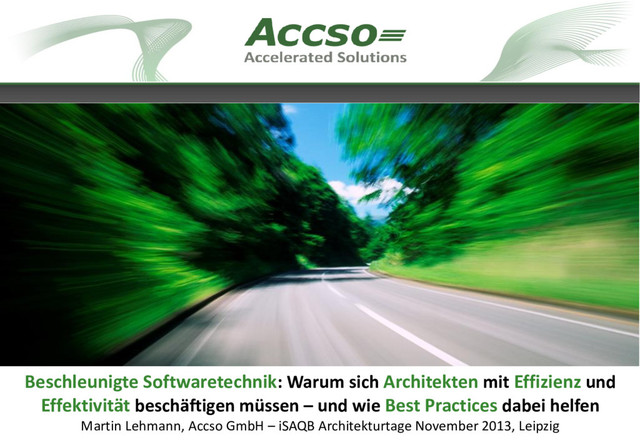 müssen – und wie Best Practices dabei helfen Martin Lehmann, Accso GmbH – iSAQB Architekturtage November 2013, Leipzig Beschleunigte Softwaretechnik: Warum sich Architekten mit Effizienz und Effektivität beschäftigen müssen – und wie Best Practices dabei helfen Martin Lehmann, Accso GmbH – iSAQB Architekturtage November 2013, Leipzig