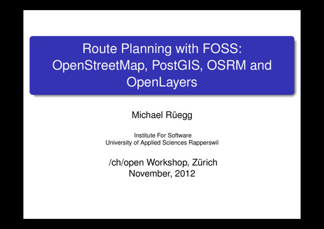 developed at University of Applied Sciences Rapperswil Travelling Salesman Problem (TSP) Uses PostGIS, OSM data, osm2pgsql, OSRM and OpenLayers Available at www.tourpl.ch ⇒ Demonstration Michael Rüegg (IFS) Route Planning with FOSS November, 2012 38 / 40