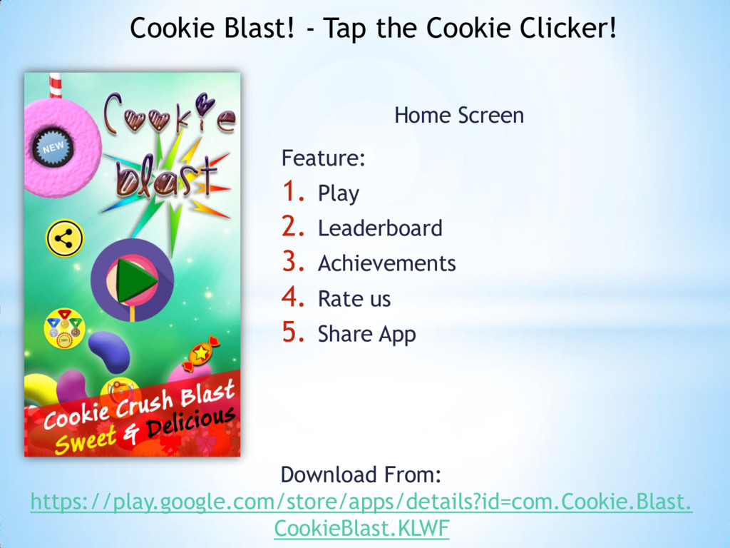more words about this Cookie clicker game but I want to say How are you becoming a superstar of Cookie Clicker? Yes, you will be a superstar of Cookie Clicker to play game and draw your name on the Play leader board and take your lots achievements. Cookie Blast! - Tap the Cookie Clicker!