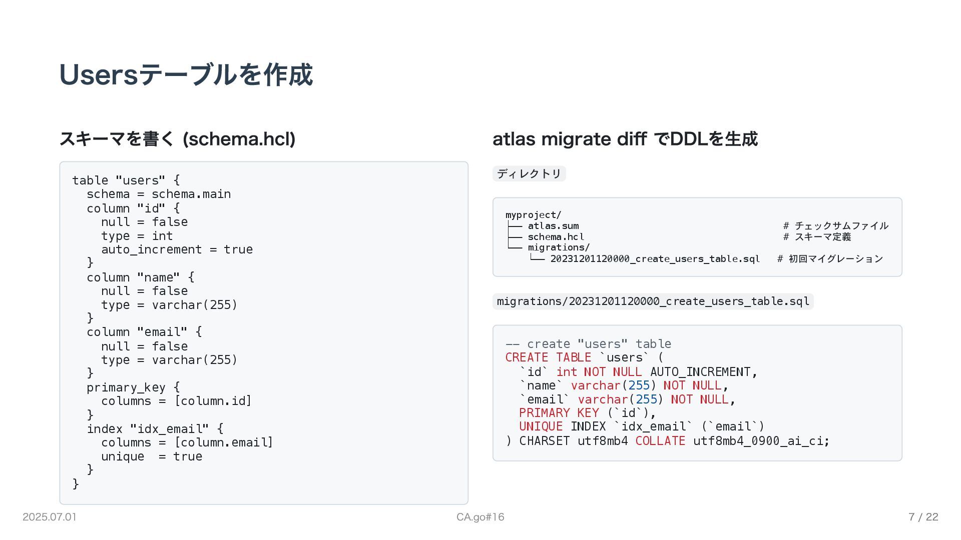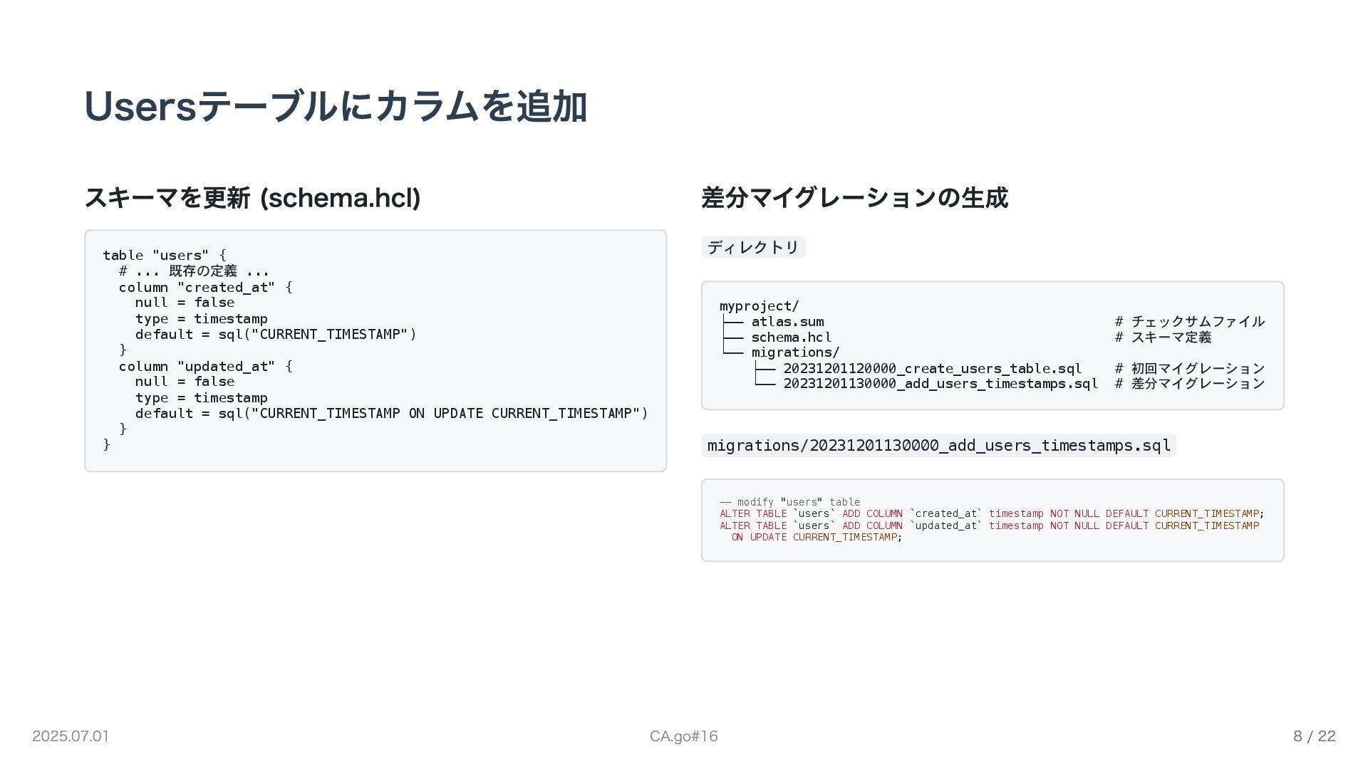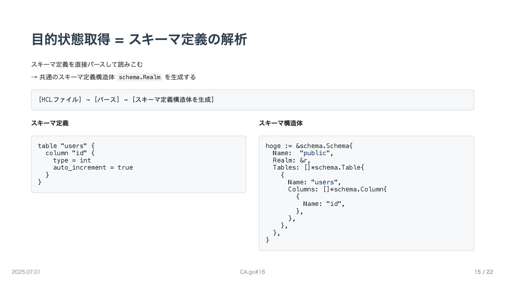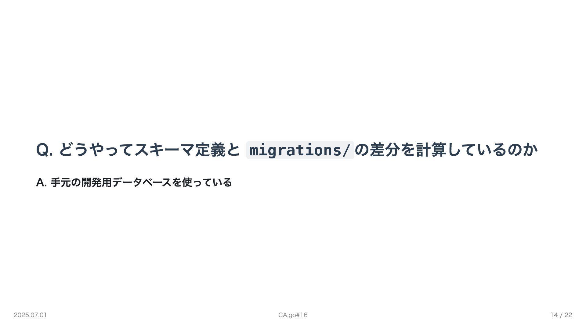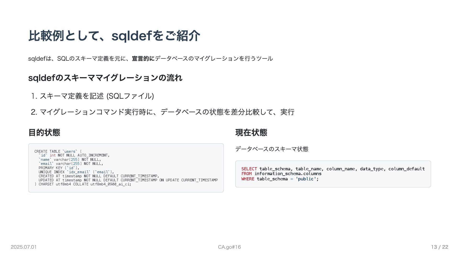 TABLE `users` ( `id` int NOT NULL AUTO_INCREMENT, `name` varchar(255) NOT NULL, `email` varchar(255) NOT NULL, PRIMARY KEY (`id`), UNIQUE INDEX `idx_email` (`email`), CREATED AT timestamp NOT NULL DEFAULT CURRENT_TIMESTAMP, UPDATED AT timestamp NOT NULL DEFAULT CURRENT_TIMESTAMP ON UPDATE CURRENT_TIMESTAMP ) CHARSET utf8mb4 COLLATE utf8mb4_0900_ai_ci; 現在状態 データベースのスキーマ状態 SELECT table_schema, table_name, column_name, data_type, column_default FROM information_schema.columns WHERE table_schema = 'public'; CA.go#16 2025.07.01 13 / 22