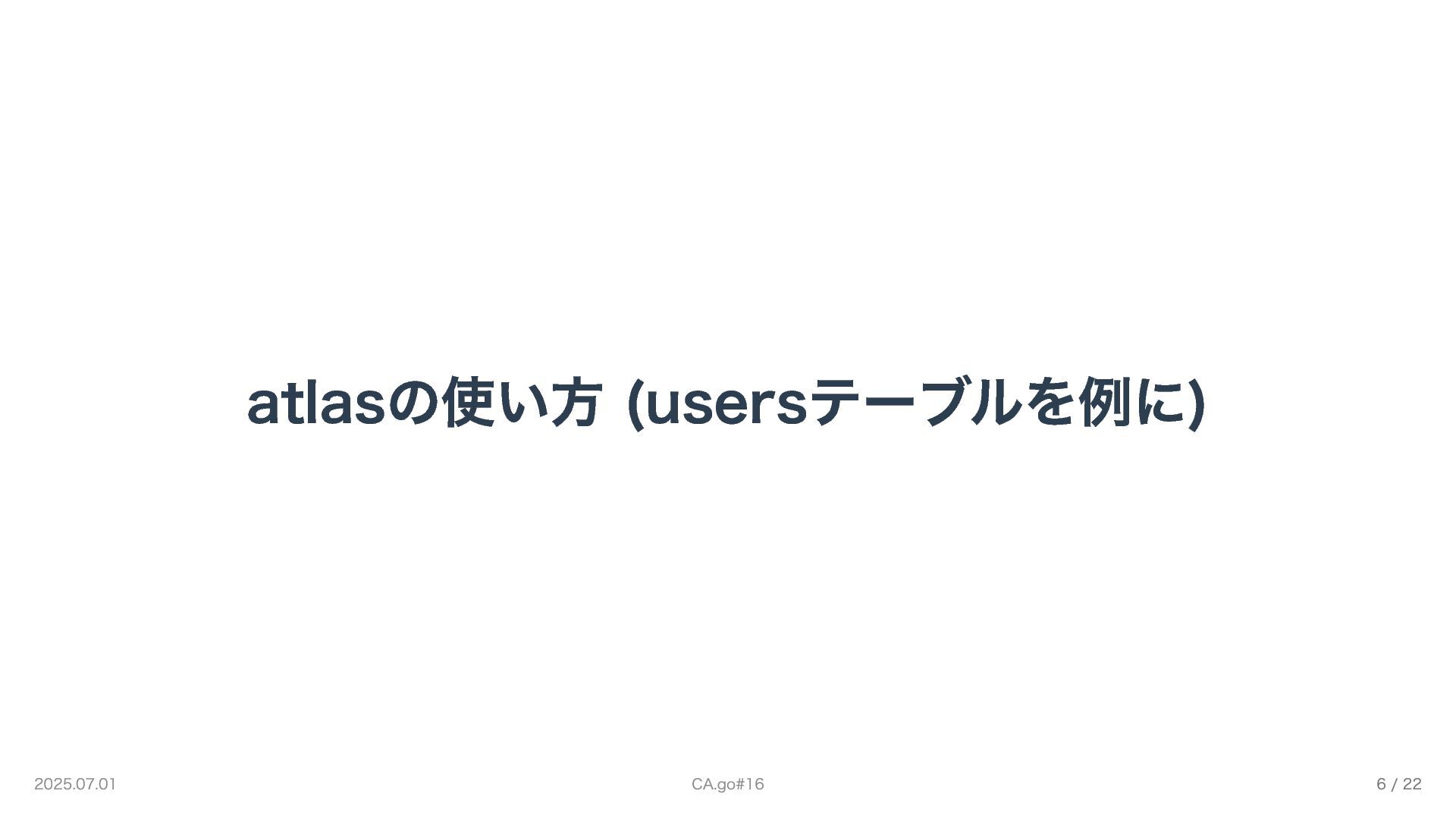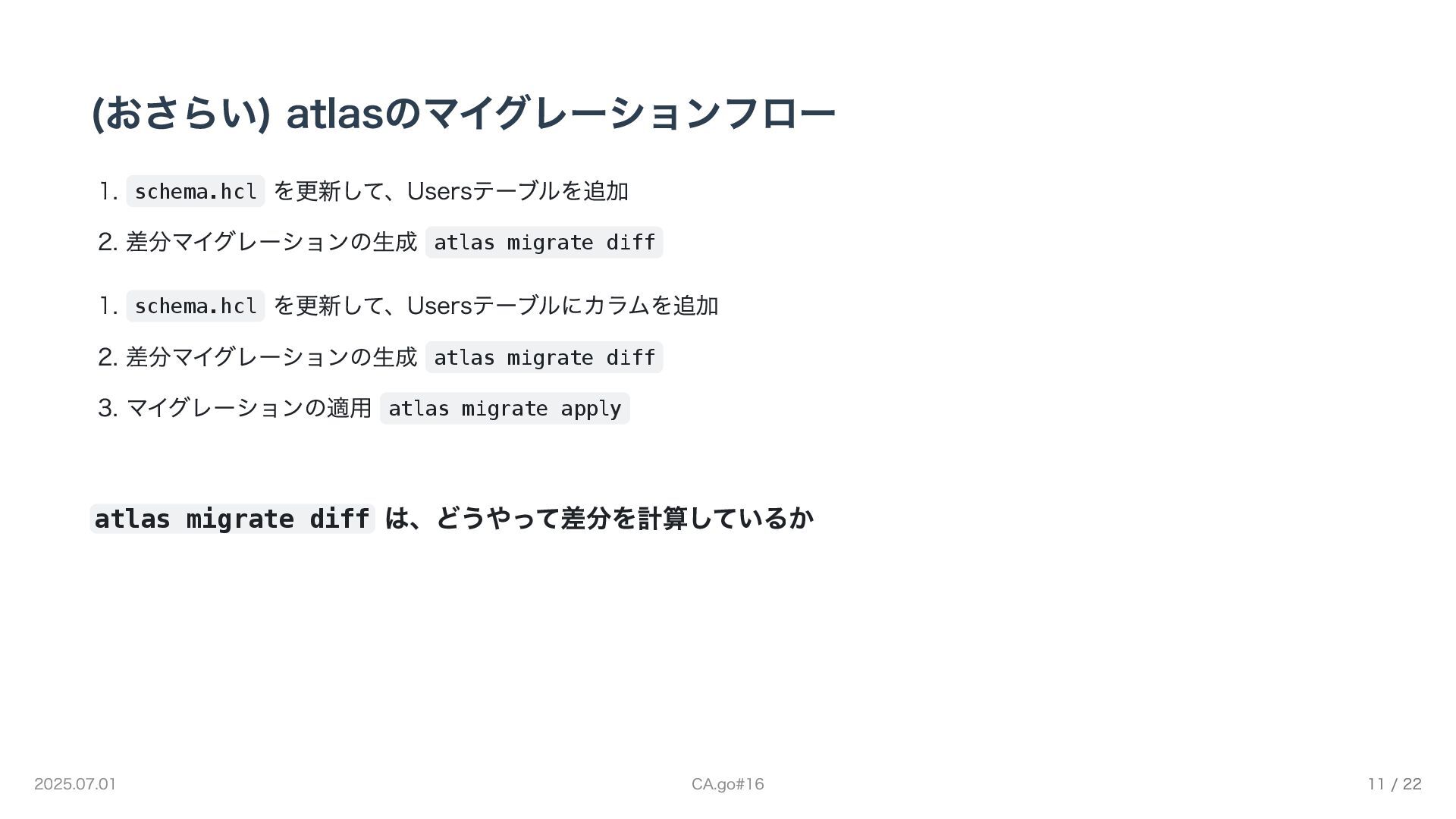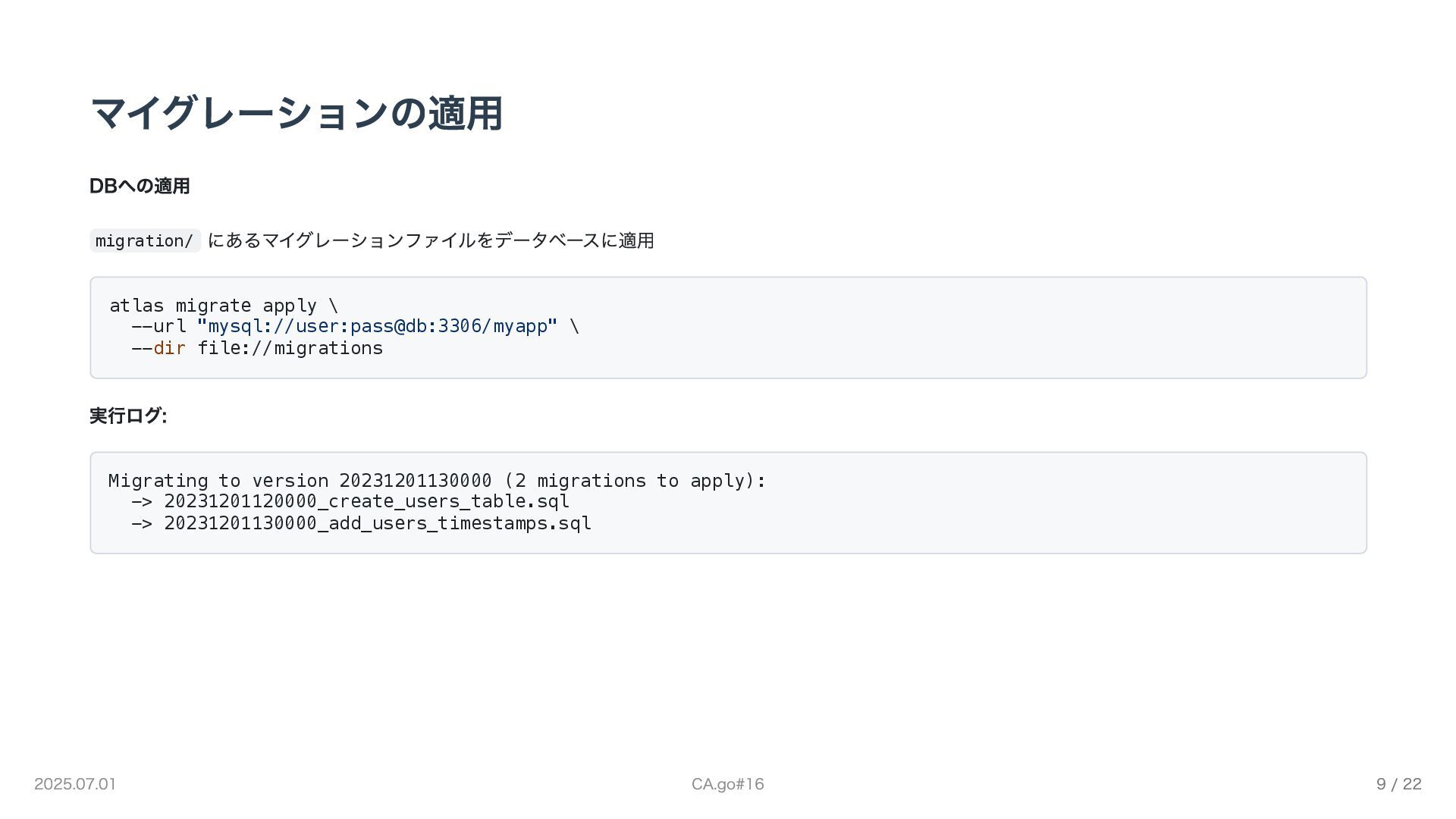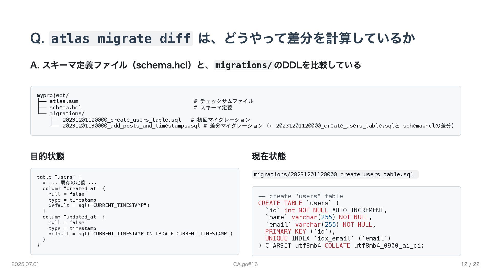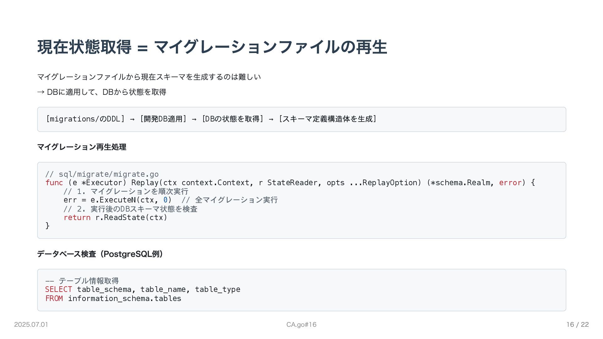 TABLE `users` ( `id` int NOT NULL AUTO_INCREMENT, `name` varchar(255) NOT NULL, `email` varchar(255) NOT NULL, PRIMARY KEY (`id`), UNIQUE INDEX `idx_email` (`email`), CREATED AT timestamp NOT NULL DEFAULT CURRENT_TIMESTAMP, UPDATED AT timestamp NOT NULL DEFAULT CURRENT_TIMESTAMP ON UPDATE CURRENT_TIMESTAMP ) CHARSET utf8mb4 COLLATE utf8mb4_0900_ai_ci; 現在状態 データベースのスキーマ状態 SELECT table_schema, table_name, column_name, data_type, column_default FROM information_schema.columns WHERE table_schema = 'public'; CA.go#16 2025.07.01 13 / 22