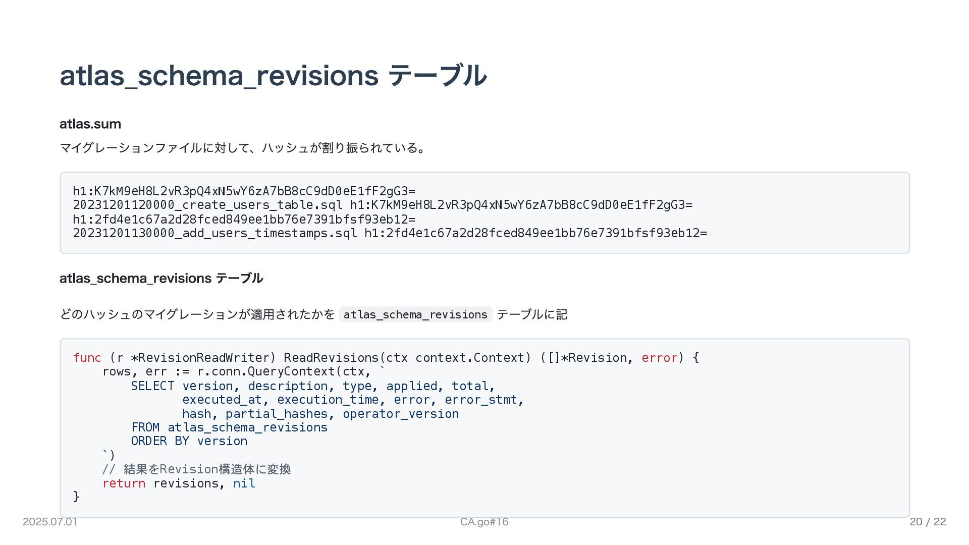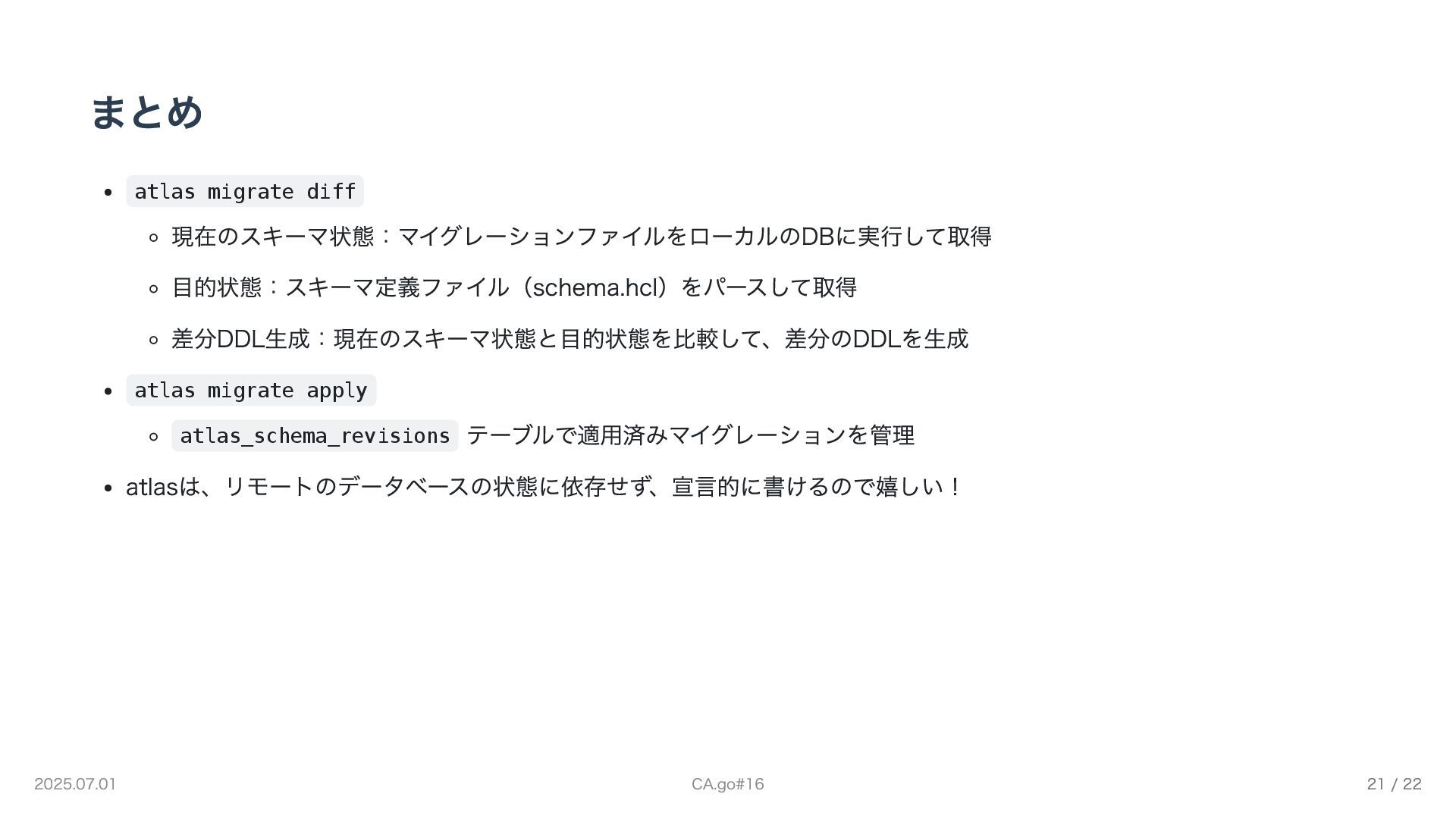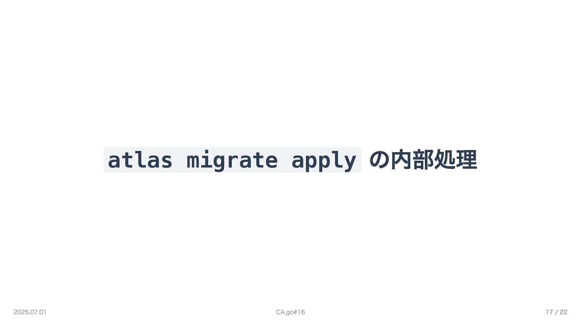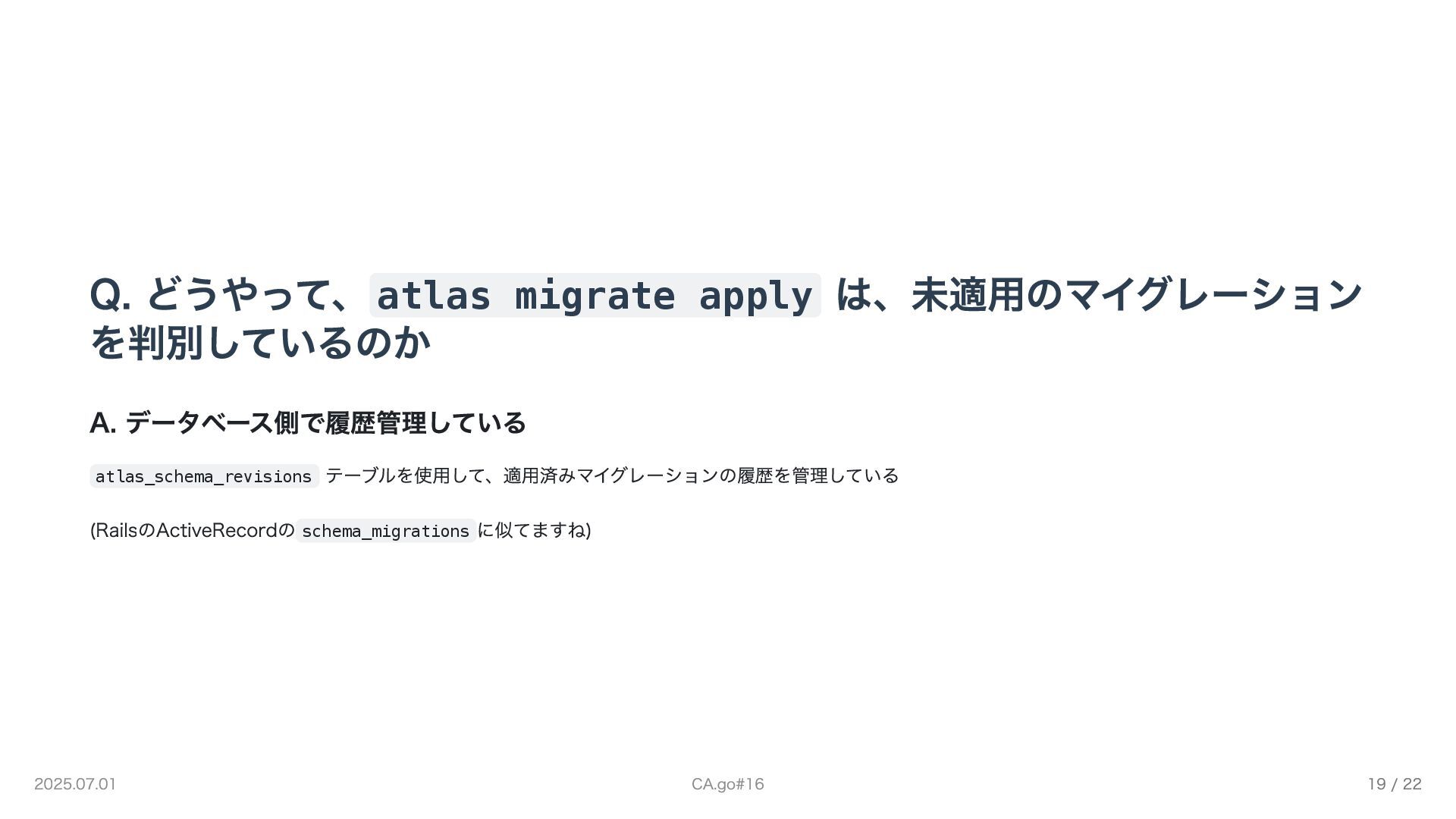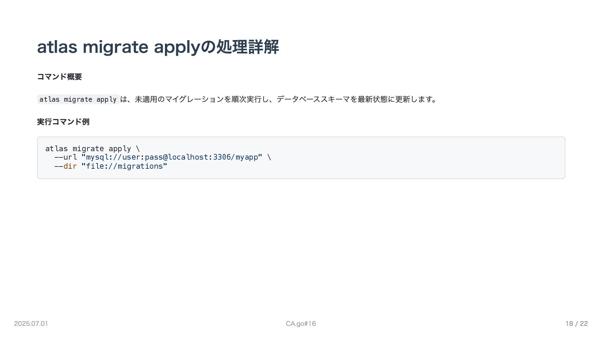 TABLE `users` ( `id` int NOT NULL AUTO_INCREMENT, `name` varchar(255) NOT NULL, `email` varchar(255) NOT NULL, PRIMARY KEY (`id`), UNIQUE INDEX `idx_email` (`email`), CREATED AT timestamp NOT NULL DEFAULT CURRENT_TIMESTAMP, UPDATED AT timestamp NOT NULL DEFAULT CURRENT_TIMESTAMP ON UPDATE CURRENT_TIMESTAMP ) CHARSET utf8mb4 COLLATE utf8mb4_0900_ai_ci; 現在状態 データベースのスキーマ状態 SELECT table_schema, table_name, column_name, data_type, column_default FROM information_schema.columns WHERE table_schema = 'public'; CA.go#16 2025.07.01 13 / 22