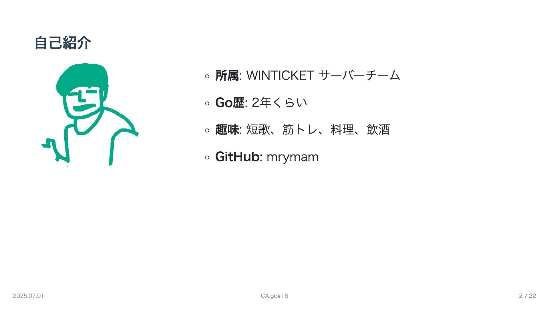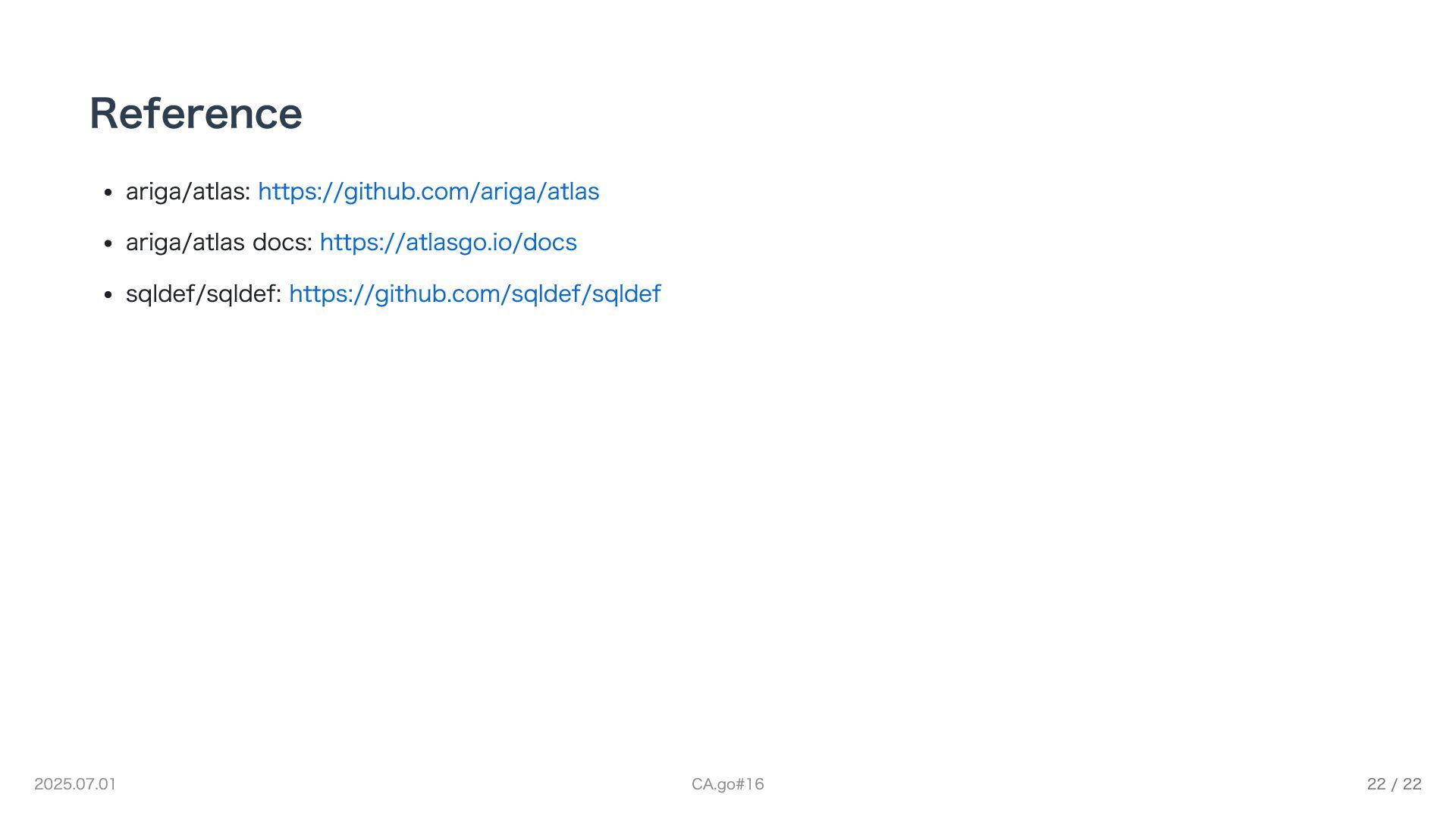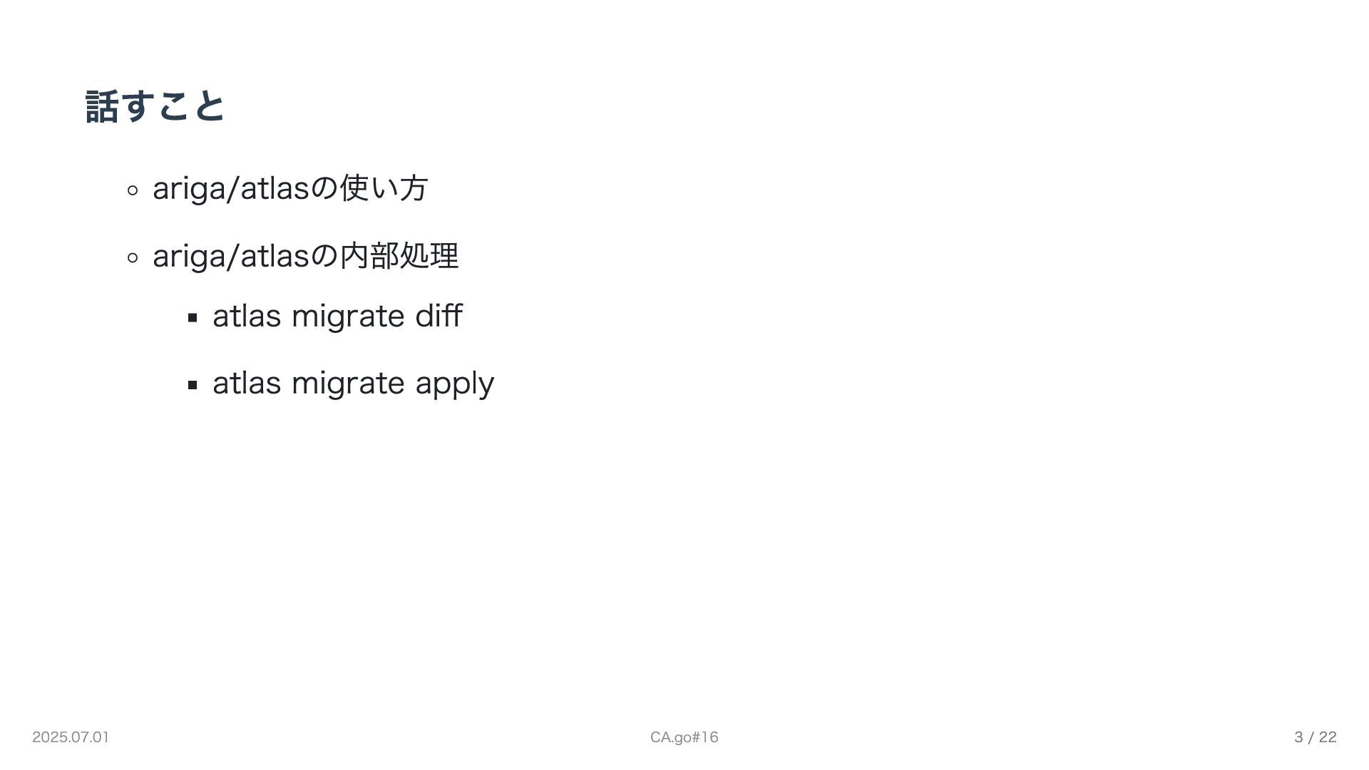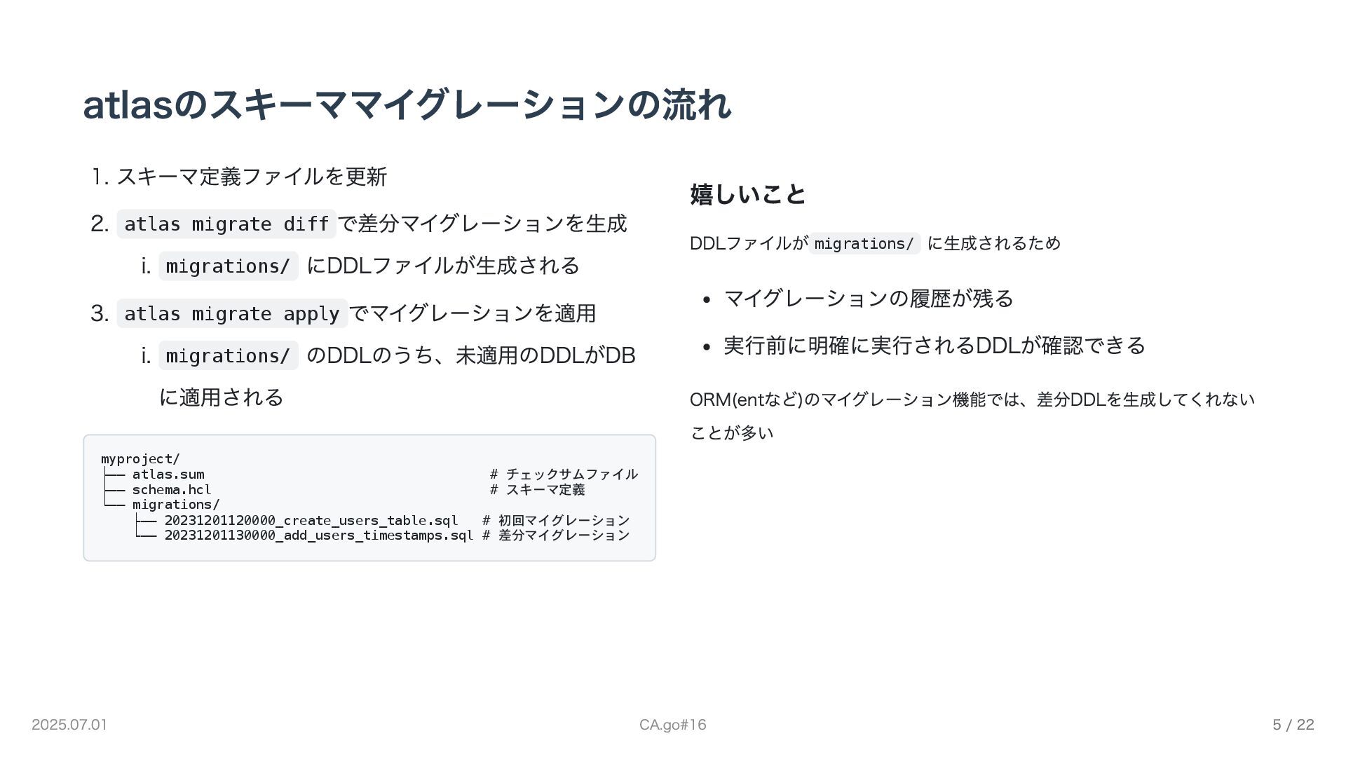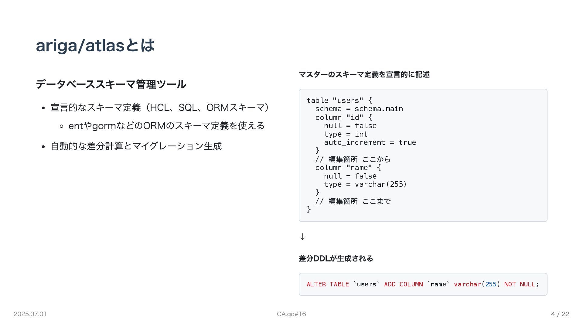 TABLE `users` ( `id` int NOT NULL AUTO_INCREMENT, `name` varchar(255) NOT NULL, `email` varchar(255) NOT NULL, PRIMARY KEY (`id`), UNIQUE INDEX `idx_email` (`email`), CREATED AT timestamp NOT NULL DEFAULT CURRENT_TIMESTAMP, UPDATED AT timestamp NOT NULL DEFAULT CURRENT_TIMESTAMP ON UPDATE CURRENT_TIMESTAMP ) CHARSET utf8mb4 COLLATE utf8mb4_0900_ai_ci; 現在状態 データベースのスキーマ状態 SELECT table_schema, table_name, column_name, data_type, column_default FROM information_schema.columns WHERE table_schema = 'public'; CA.go#16 2025.07.01 13 / 22