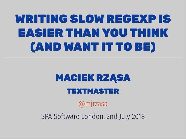 Although regular expressions are commonly used in software development, few developers think about their performance. The sad truth is that a badly written regexp can severely damage application performance (both on server-side and in a browser). How to write a regular expression that is not only correct but also efficient?