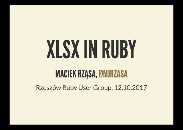 Handling XLSX files in ruby - parsing, generating; efficiency and security. Slides from presentation during Rzeszów Ruby User Group meetup.