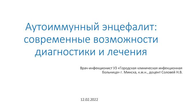 В презентации рассмотрены ключевые возможности диагностики и лечения аутоиммунных энцефалитов. Акцент сделан на anti-NMDAR энцефалит как наиболее распространенный вариант данной группы заболеваний. Показана взаимосвязь между COVID-19 и вторичными аутоиммунными поражениями нервной системы.