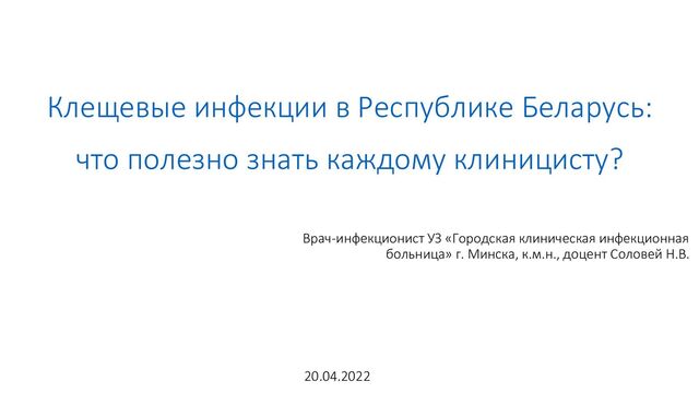Представлены данные об этиологии ключевых клещевых инфекций в Республике Беларусь. Рассмотрены ключевые подходы к диагностике и лечению болезни Лайма и клещевого энцефалита, а также других более редких клещевых инфекций.
