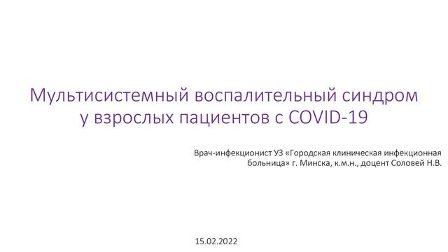 взрослых пациентов с активной или недавно перенесенной COVID-19 инфекцией (подтвержденной ПЦР или детекцией АГ), развивающих различные органные поражения на фоне лихорадки (вплоть до септического шока и СПОН) при минимальной респираторной симптоматике, сопровождающиеся маркерами тяжелого воспаления (высокие значения СРБ, ферритина, Д-димеров, повышение кардиоспецифических ферментов, АЛТ и АСТ, креатинина) • данные случаи получили название мультисистемный воспалительный синдром у взрослых (MIS-A) по аналогии со схожим состоянием у детей (MIS-C) NIH Coronavirus Disease 2019 (COVID-19) Treatment Guidelines 2022