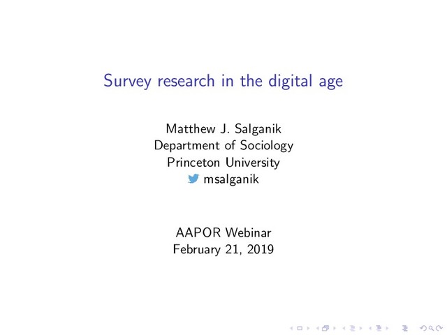 These slides are from a webinar organized by the American Association of Public Opinion Research (AAPOR). More information: https://www.aapor.org/Education-Resources/Online-Education/Webinar-Details.aspx?webinar=WEB0219