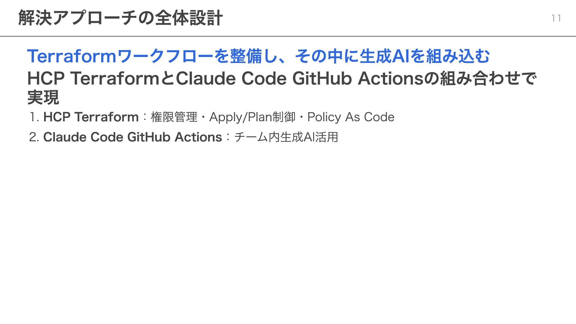 Terraformワークフローを整備し、その中に生成AIを組み込む HCP TerraformとClaude Code GitHub Actionsの組み合わせで 実現 1. HCP Terraform:権限管理・Apply/Plan制御・Policy