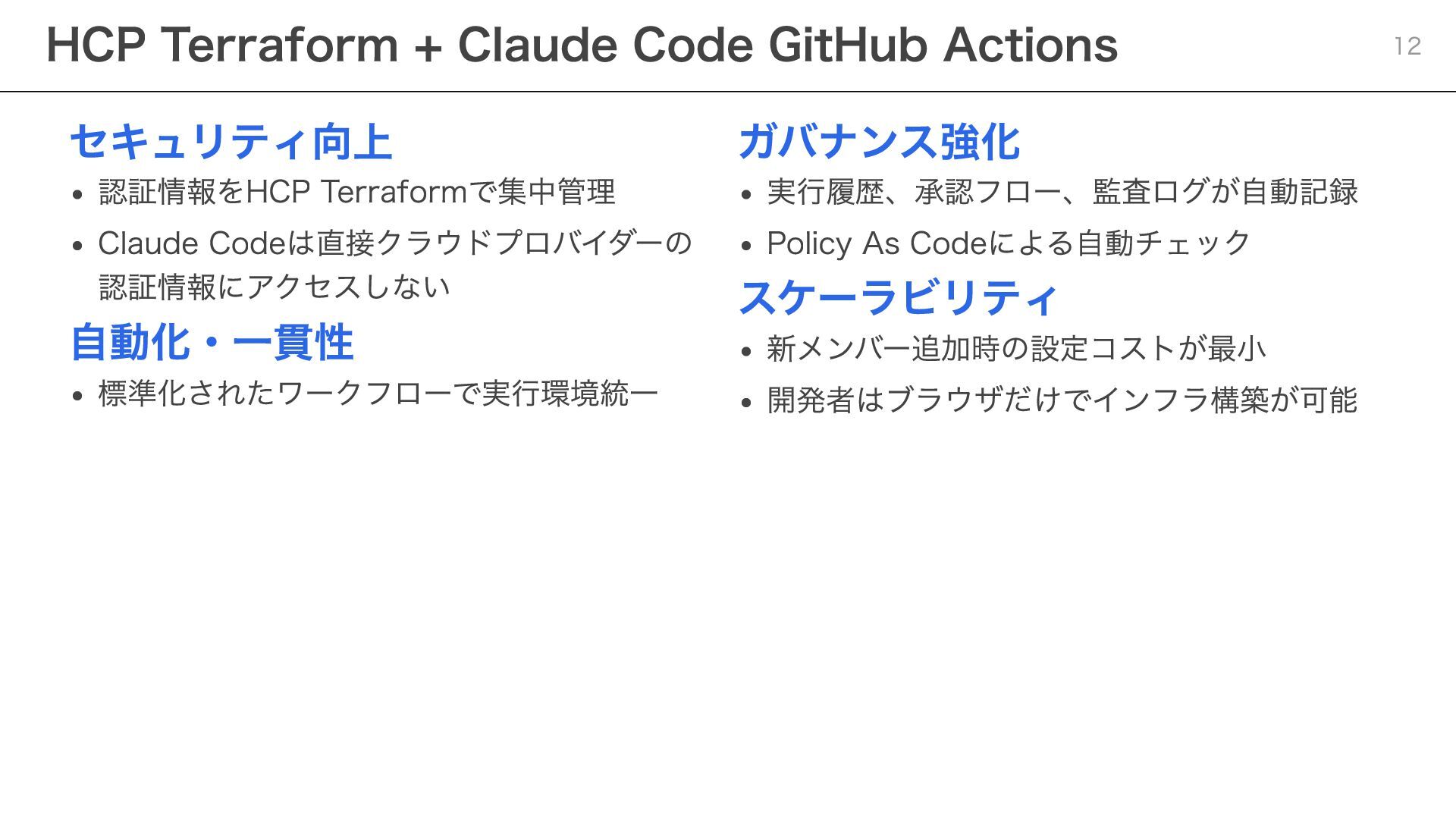 セキュリティ向上 認証情報をHCP Terraformで集中管理 Claude Codeは直接クラウドプロバイダーの 認証情報にアクセスしない 自動化・一貫性 標準化されたワークフローで実行環境統一 ガバナンス強化 実行履歴、承認フロー、監査ログが自動記録