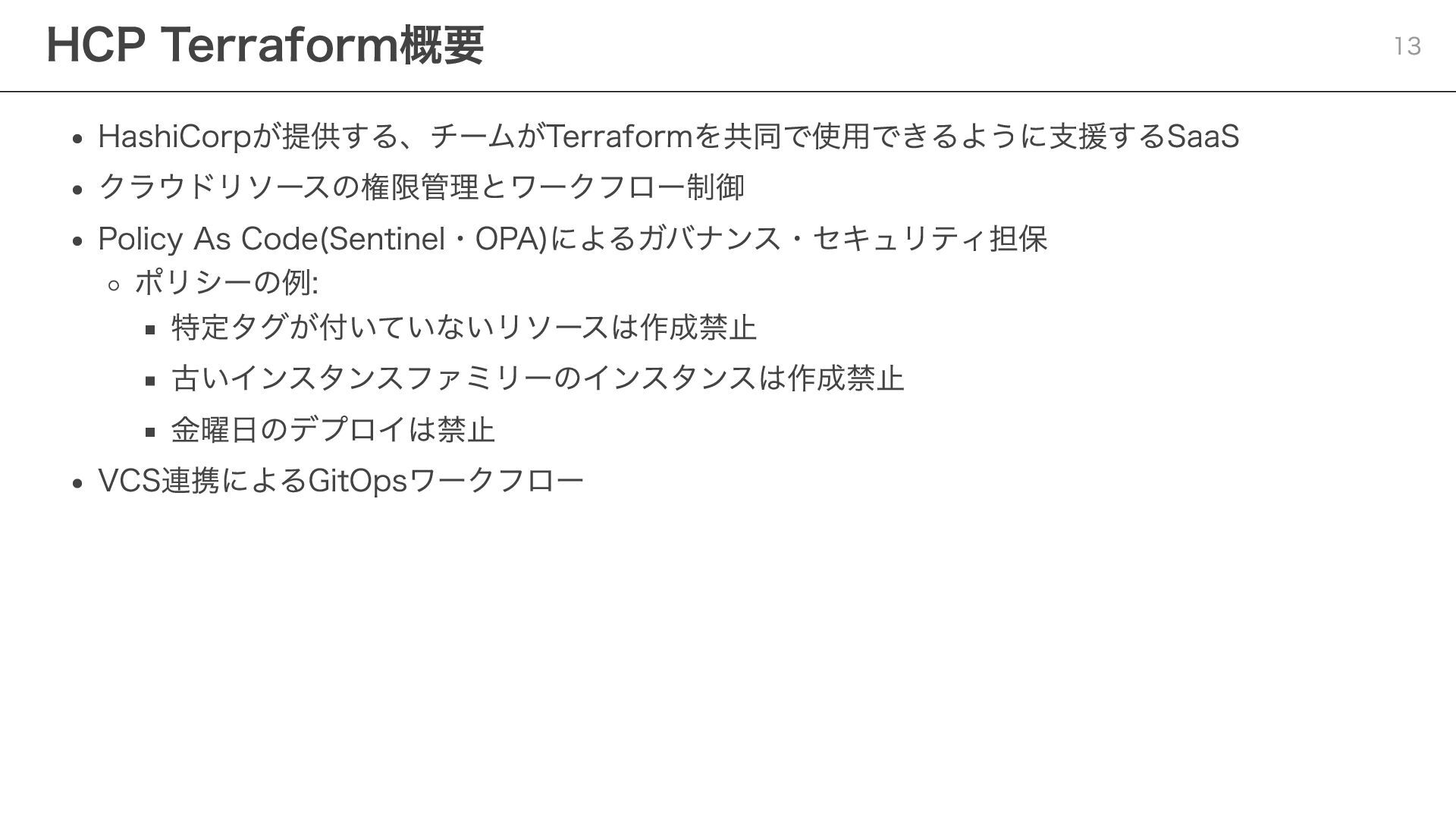 HashiCorpが提供する、チームがTerraformを共同で使用できるように支援するSaaS クラウドリソースの権限管理とワークフロー制御 Policy As Code(Sentinel・OPA)によるガバナンス・セキュリティ担保 ポリシーの例: 特定タグが付いていないリソースは作成禁止 古いインスタンスファミリーのインスタンスは作成禁止 金曜日のデプロイは禁止 VCS連携によるGitOpsワークフロー