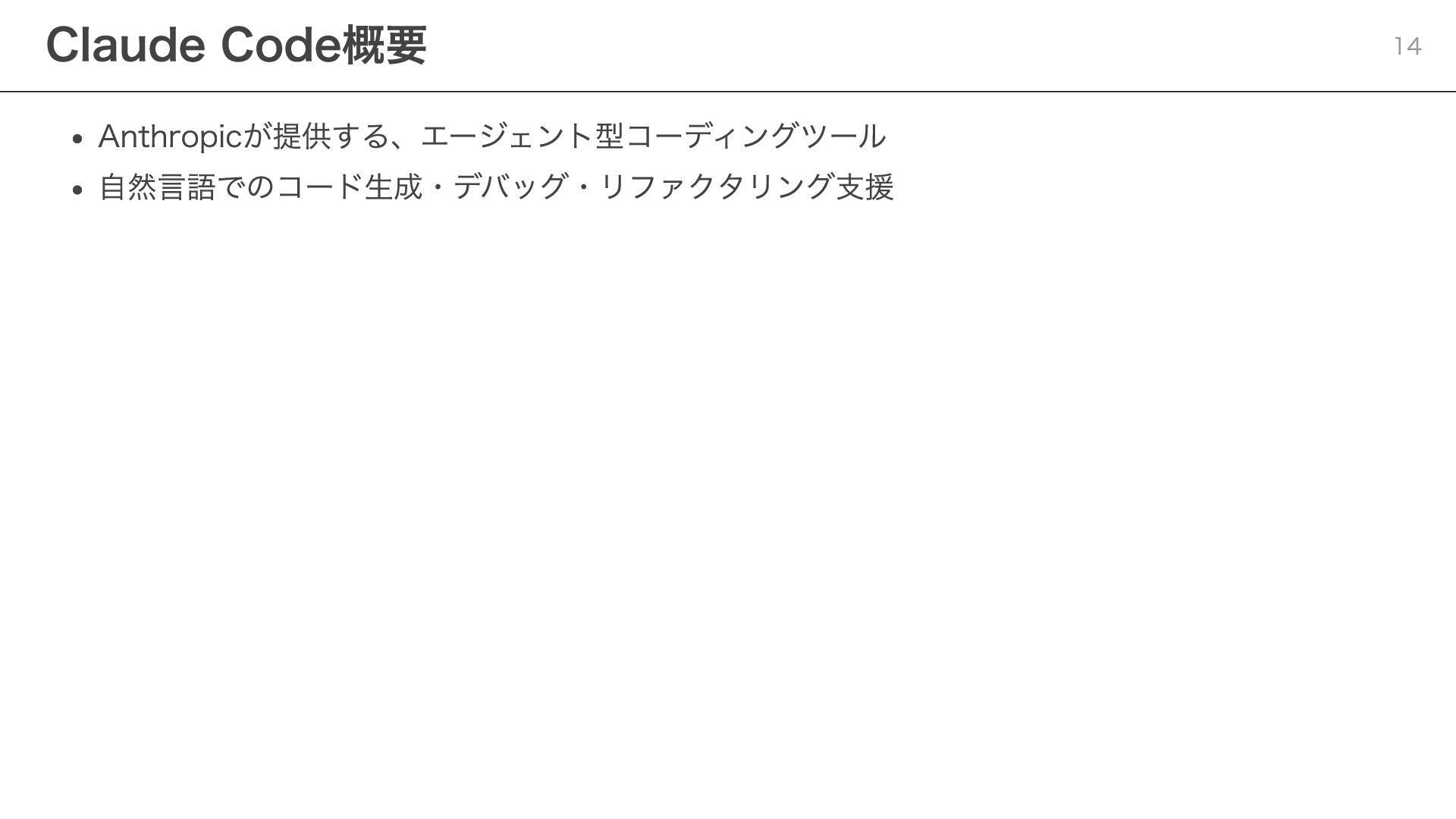 Anthropicが提供する、エージェント型コーディングツール 自然言語でのコード生成・デバッグ・リファクタリング支援 Claude Code概要 14
