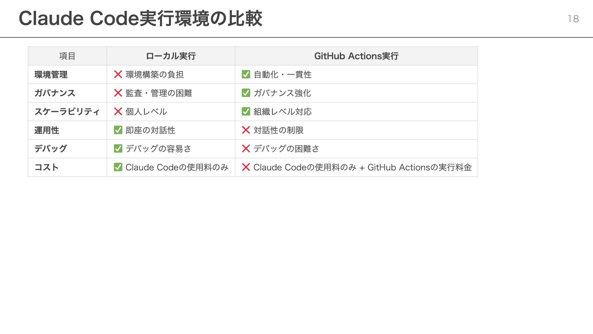 スケーラビリティ 個人レベル 組織レベル対応 運用性 即座の対話性 対話性の制限 デバッグ デバッグの容易さ デバッグの困難さ コスト Claude Codeの使用料のみ Claude Codeの使用料のみ + GitHub Actionsの実行料金 Claude Code実行環境の比較 18