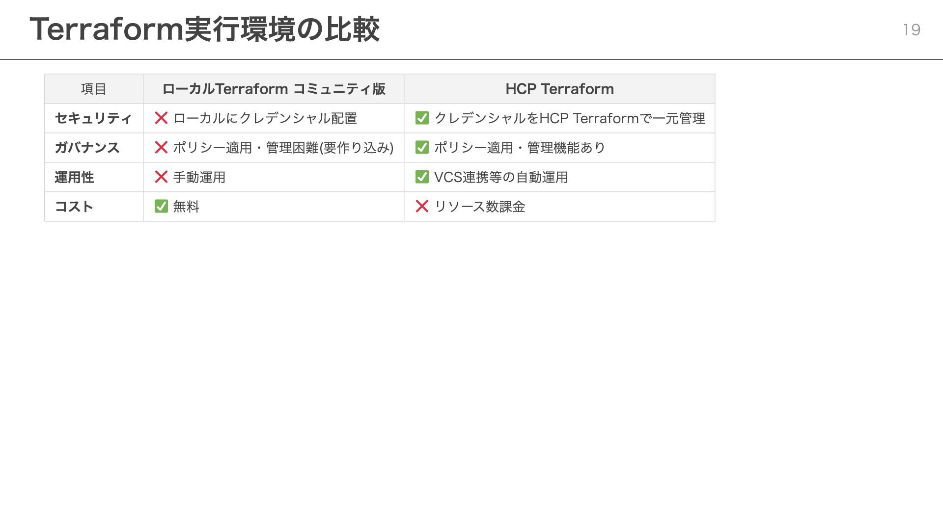 項目 ローカルTerraform コミュニティ版 HCP Terraform セキュリティ ローカルにクレデンシャル配置 クレデンシャルをHCP Terraformで一元管理 ガバナンス