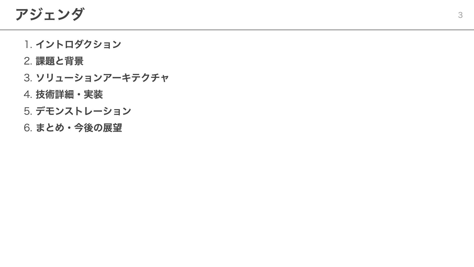 1. イントロダクション 2. 課題と背景 3. ソリューションアーキテクチャ 4. 技術詳細・実装 5. デモンストレーション