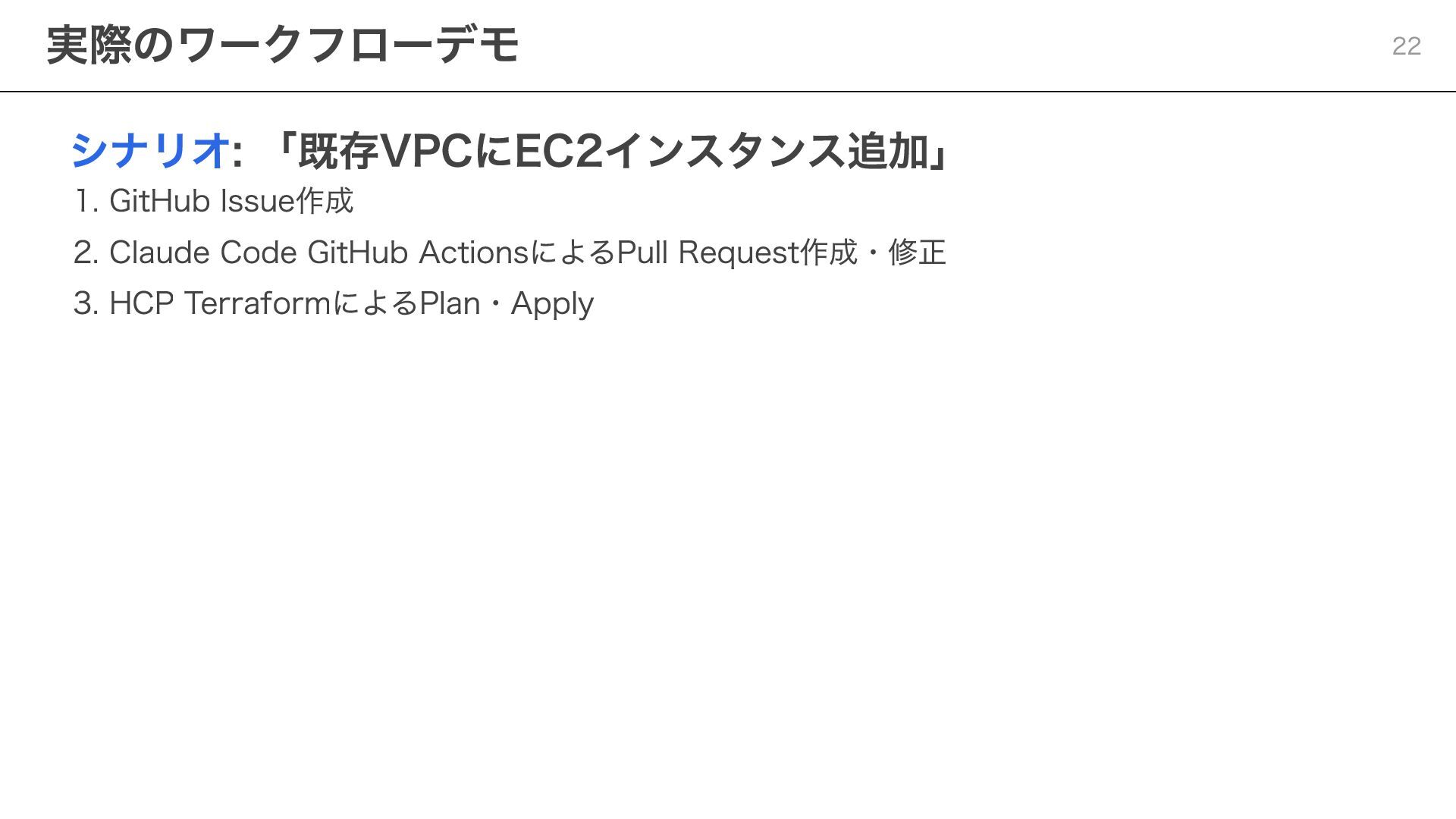 シナリオ: 「既存VPCにEC2インスタンス追加」 1. GitHub Issue作成 2. Claude Code GitHub ActionsによるPull