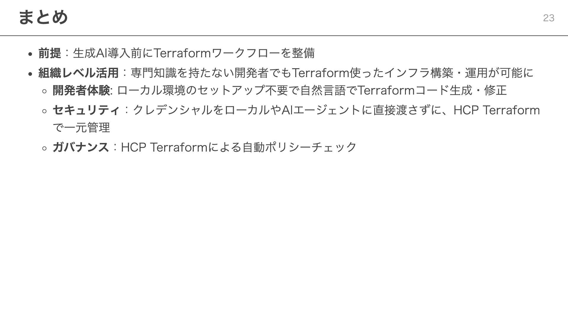 前提:生成AI導入前にTerraformワークフローを整備 組織レベル活用:専門知識を持たない開発者でもTerraform使ったインフラ構築・運用が可能に 開発者体験: ローカル環境のセットアップ不要で自然言語でTerraformコード生成・修正 セキュリティ:クレデンシャルをローカルやAIエージェントに直接渡さずに、HCP Terraform で一元管理 ガバナンス:HCP Terraformによる自動ポリシーチェック まとめ
