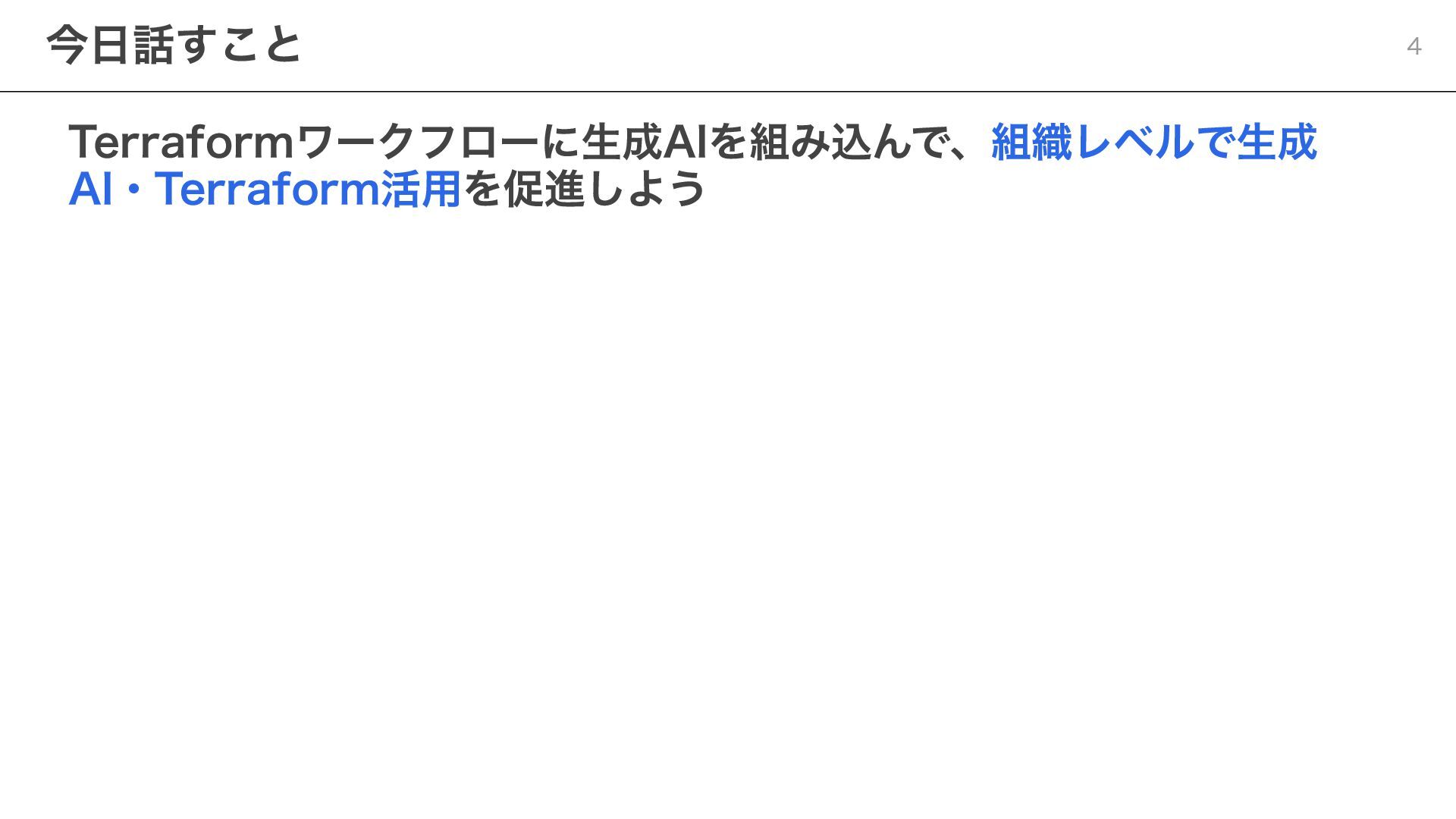 Terraformワークフローに生成AIを組み込んで、組織レベルで生成 AI・Terraform活用を促進しよう 今日話すこと 4