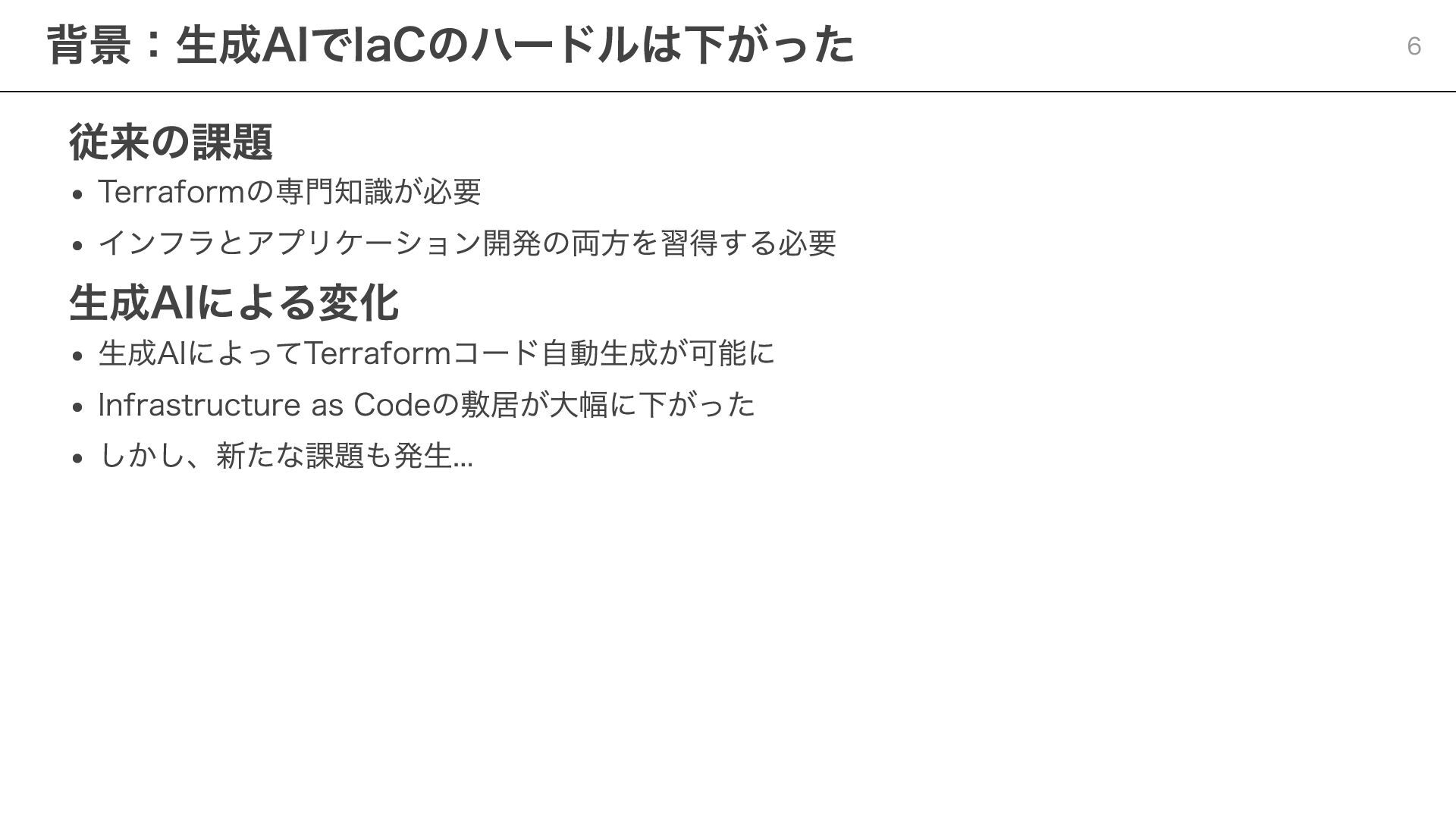 従来の課題 Terraformの専門知識が必要 インフラとアプリケーション開発の両方を習得する必要 生成AIによる変化 生成AIによってTerraformコード自動生成が可能に Infrastructure as Codeの敷居が大幅に下がった しかし、新たな課題も発生... 背景:生成AIでIaCのハードルは下がった