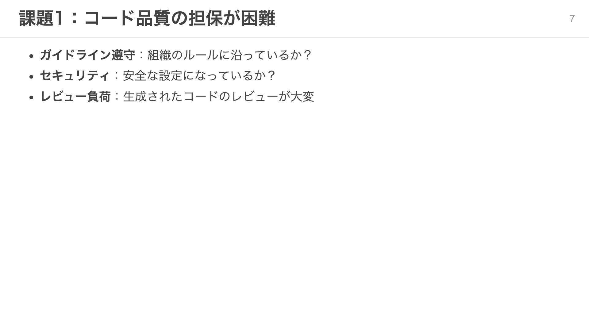 ガイドライン遵守:組織のルールに沿っているか? セキュリティ:安全な設定になっているか? レビュー負荷:生成されたコードのレビューが大変 課題1:コード品質の担保が困難 7
