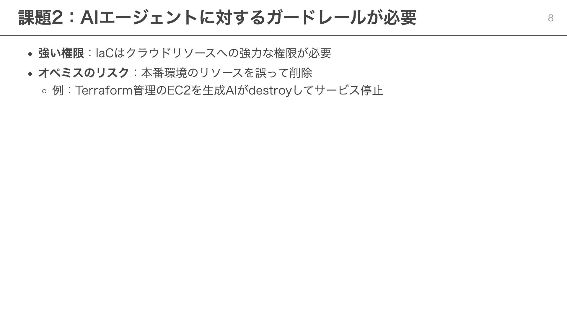 強い権限:IaCはクラウドリソースへの強力な権限が必要 オペミスのリスク:本番環境のリソースを誤って削除 例:Terraform管理のEC2を生成AIがdestroyしてサービス停止 課題2:AIエージェントに対するガードレールが必要 8