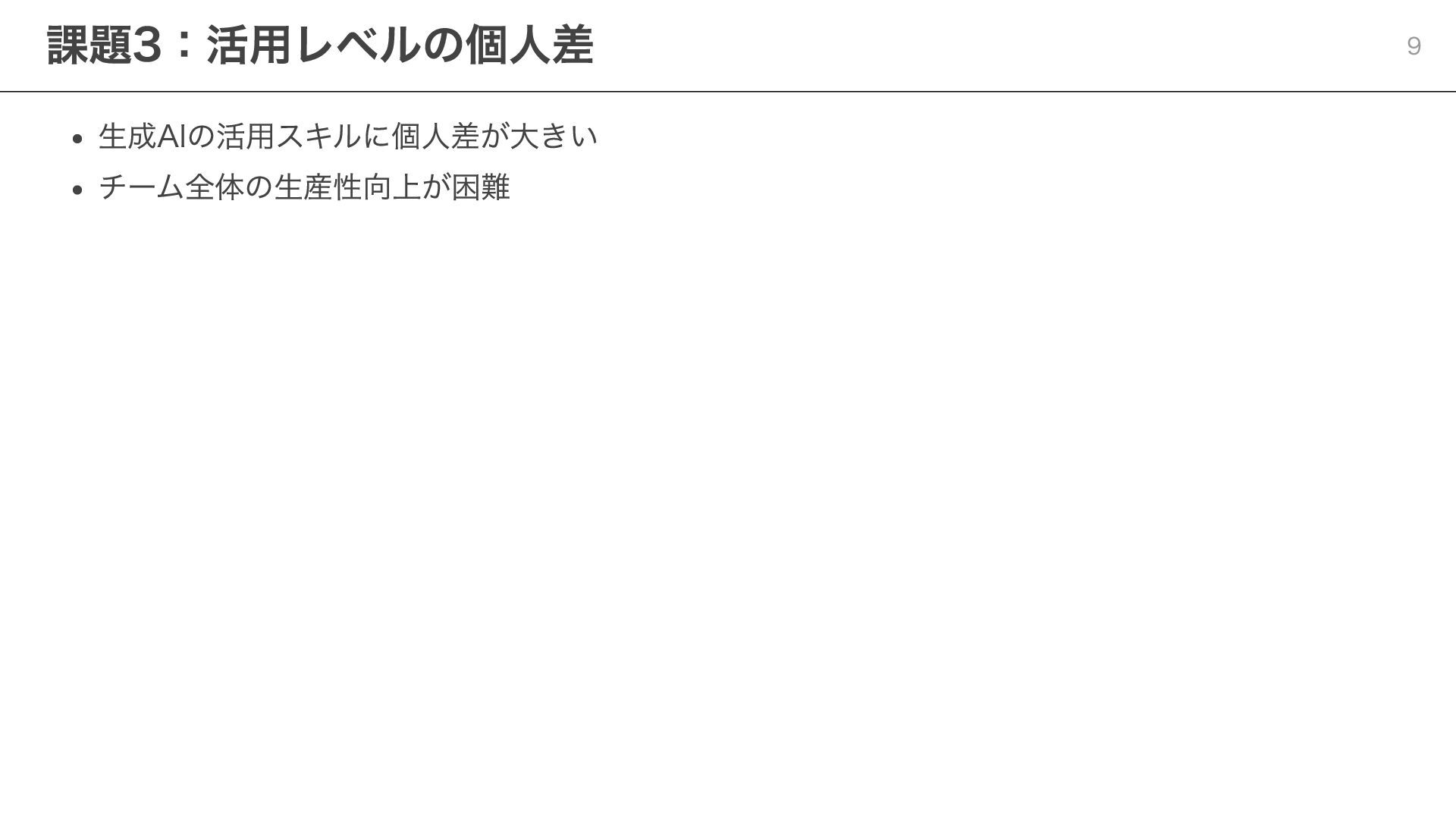 生成AIの活用スキルに個人差が大きい チーム全体の生産性向上が困難 課題3:活用レベルの個人差 9