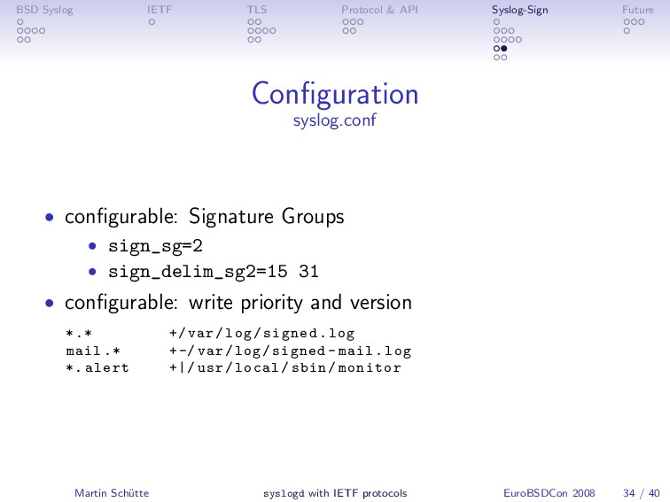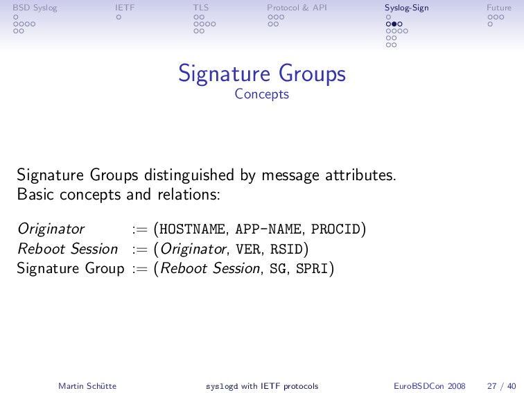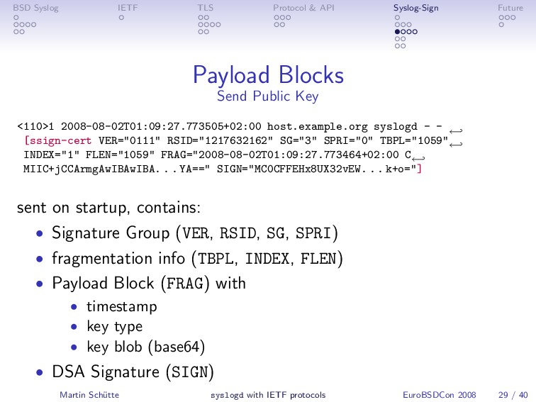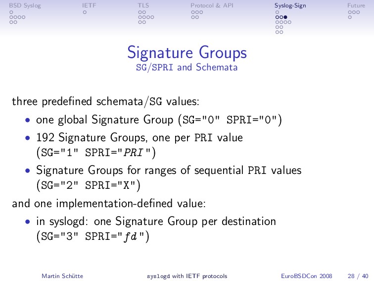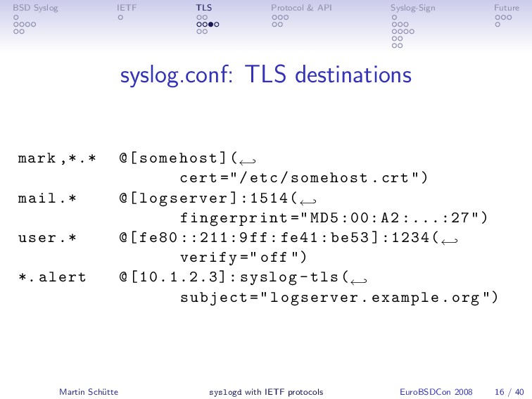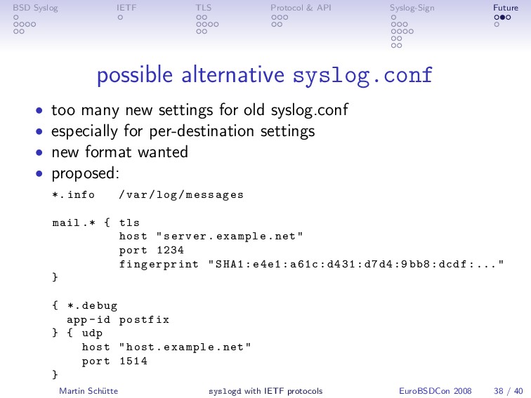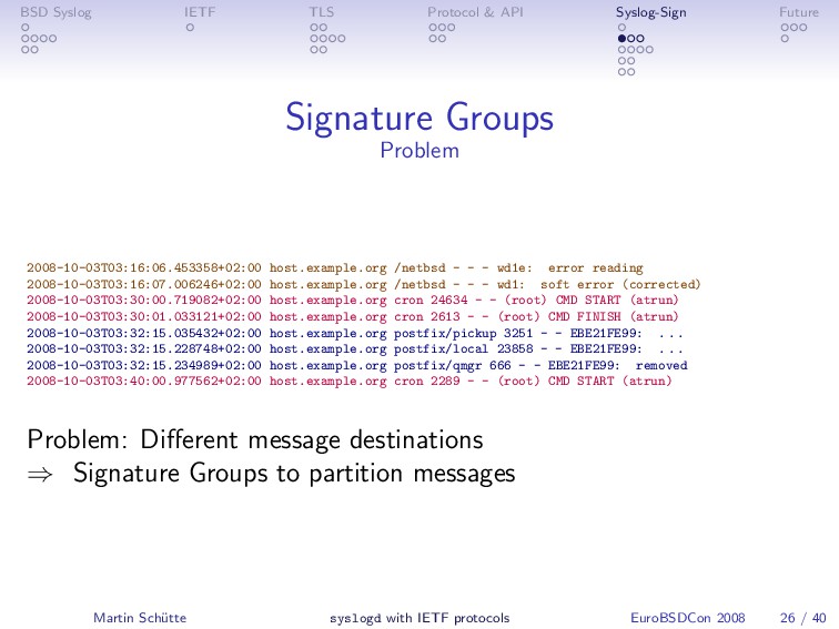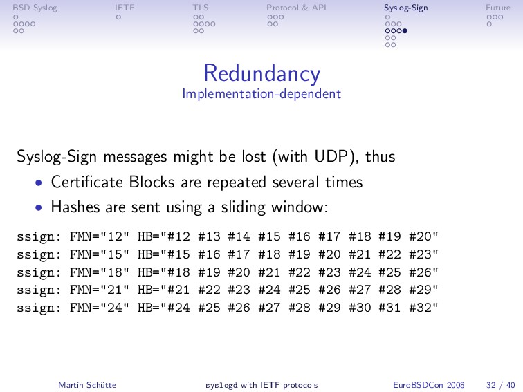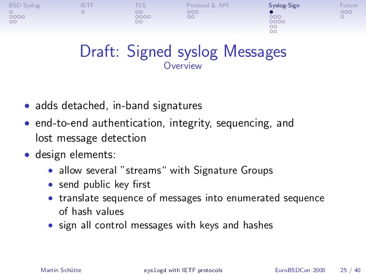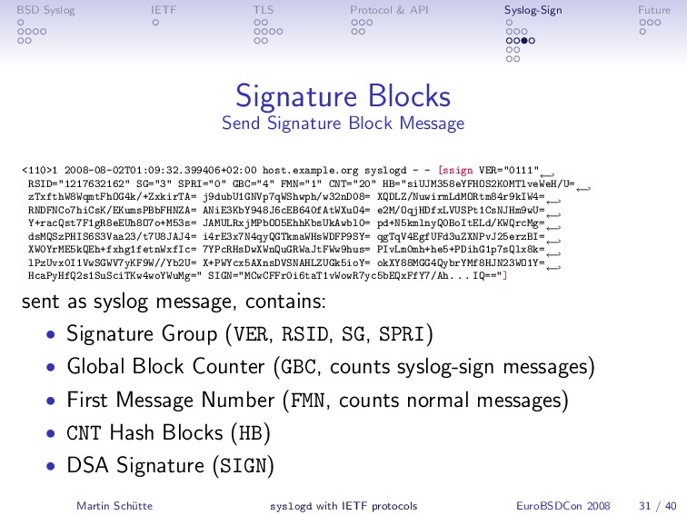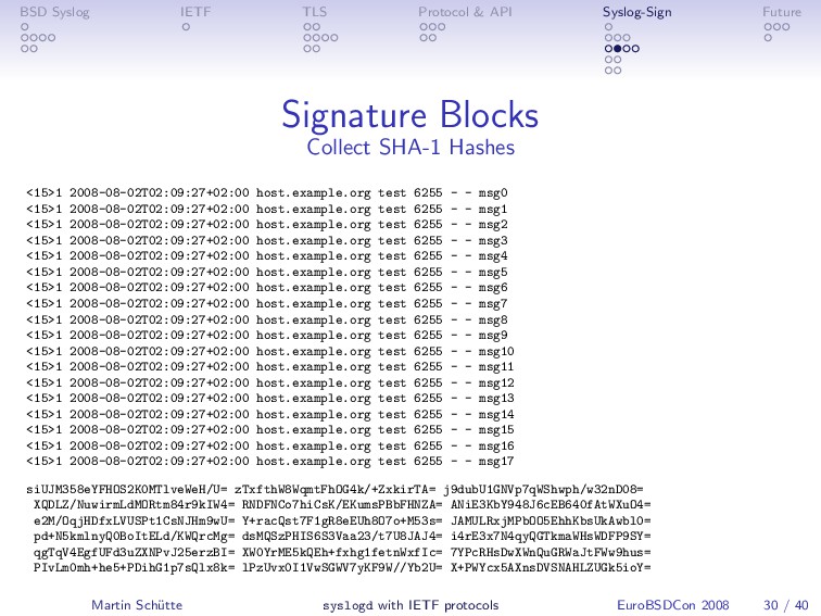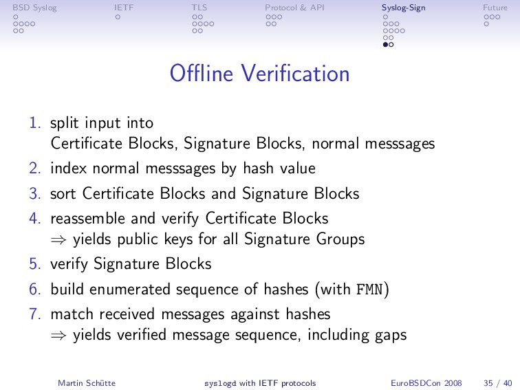 $ perl verify.pl -i test.log reading input ... processing CBs ... decoding SGs ... got PKIX DSA key verifying CBs ... verified CB and got key for SG: (host.example.org ,1217632162 ,0111 ,3 ,0) ,← start: 2008 -08 -02 T01 :09:27.773464+02:00 now process SBs signed messages: ... host.example.org ,1217632162 ,0111 ,3 ,0 ,11 <15>1 ... test 6255 - - msg10 host.example.org ,1217632162 ,0111 ,3 ,0 ,12 <15>1 ... test 6255 - - msg11 host.example.org ,1217632162 ,0111 ,3 ,0 ,13 **** msg lost host.example.org ,1217632162 ,0111 ,3 ,0 ,14 <15>1 ... test 6255 - - msg13 host.example.org ,1217632162 ,0111 ,3 ,0 ,15 <15>1 ... test 6255 - - msg14 host.example.org ,1217632162 ,0111 ,3 ,0 ,16 <15>1 ... test 6255 - - msg15 ... messages without signature: <15>1 2008 -08 -02 T02 :09:27+02:00 host.example.org test 6255 - - modified msg12 Martin Schütte syslogd with IETF protocols EuroBSDCon 2008 36 / 40