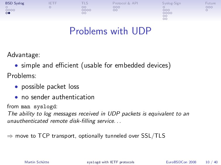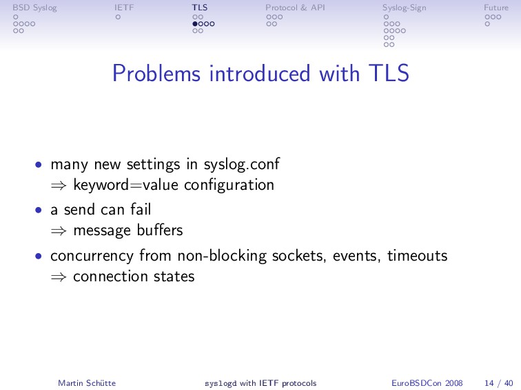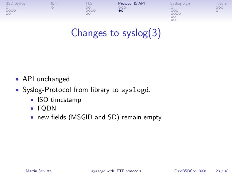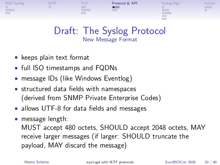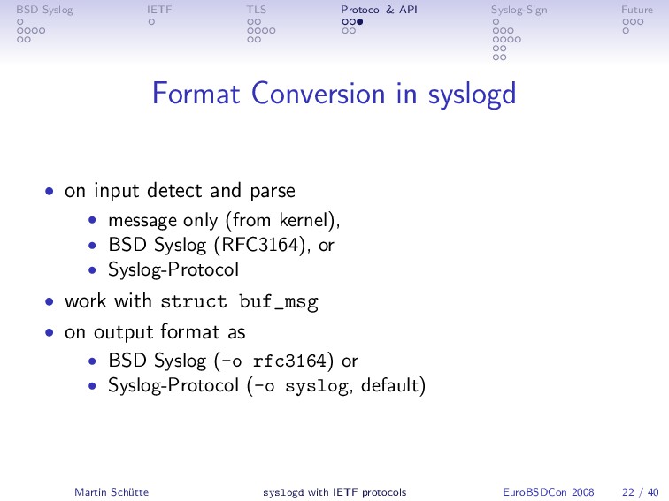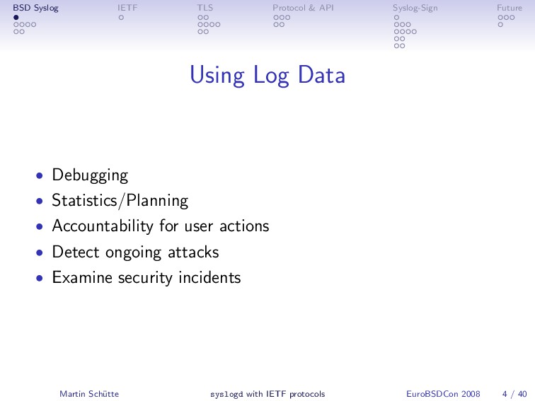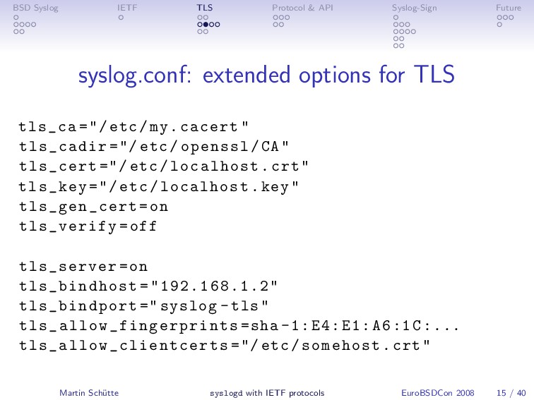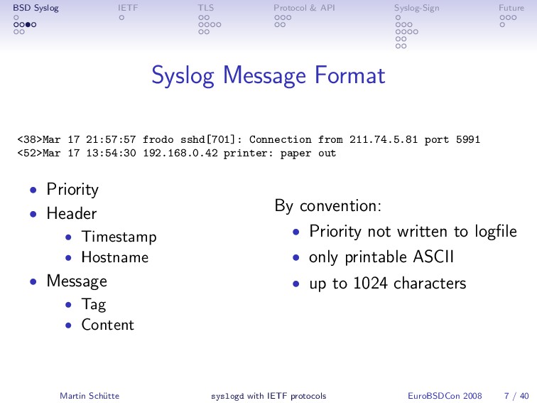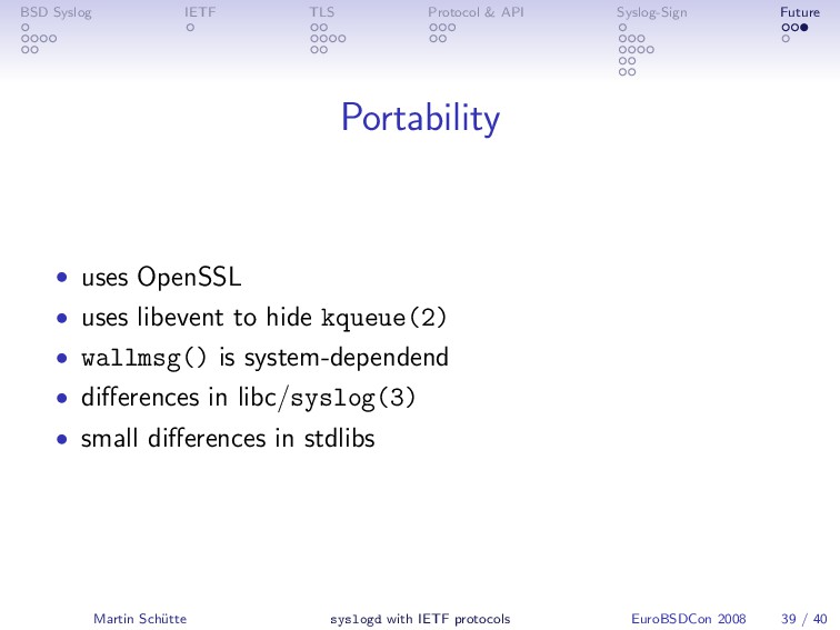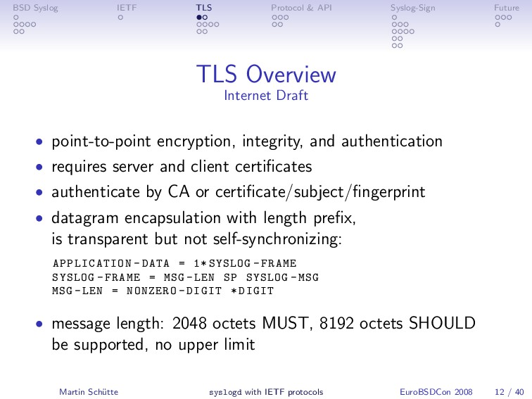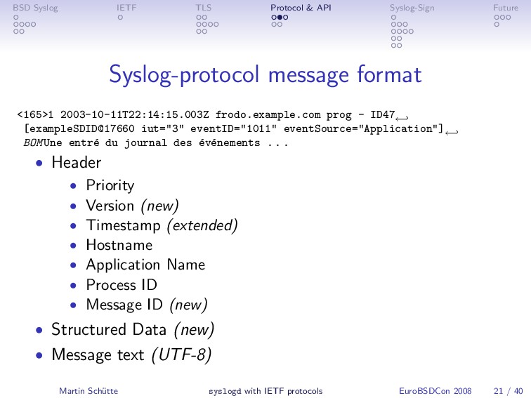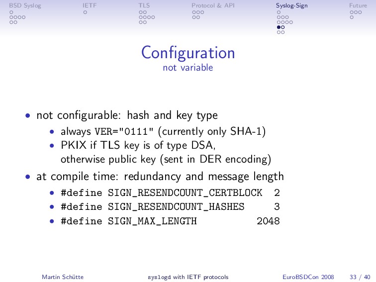 $ perl verify.pl -i test.log reading input ... processing CBs ... decoding SGs ... got PKIX DSA key verifying CBs ... verified CB and got key for SG: (host.example.org ,1217632162 ,0111 ,3 ,0) ,← start: 2008 -08 -02 T01 :09:27.773464+02:00 now process SBs signed messages: ... host.example.org ,1217632162 ,0111 ,3 ,0 ,11 <15>1 ... test 6255 - - msg10 host.example.org ,1217632162 ,0111 ,3 ,0 ,12 <15>1 ... test 6255 - - msg11 host.example.org ,1217632162 ,0111 ,3 ,0 ,13 **** msg lost host.example.org ,1217632162 ,0111 ,3 ,0 ,14 <15>1 ... test 6255 - - msg13 host.example.org ,1217632162 ,0111 ,3 ,0 ,15 <15>1 ... test 6255 - - msg14 host.example.org ,1217632162 ,0111 ,3 ,0 ,16 <15>1 ... test 6255 - - msg15 ... messages without signature: <15>1 2008 -08 -02 T02 :09:27+02:00 host.example.org test 6255 - - modified msg12 Martin Schütte syslogd with IETF protocols EuroBSDCon 2008 36 / 40