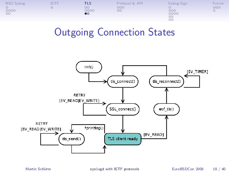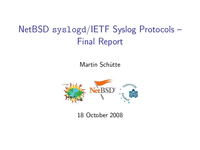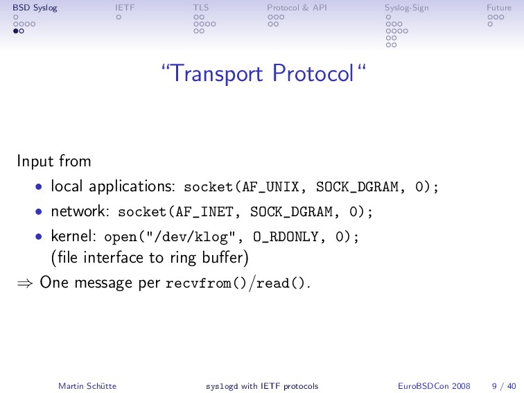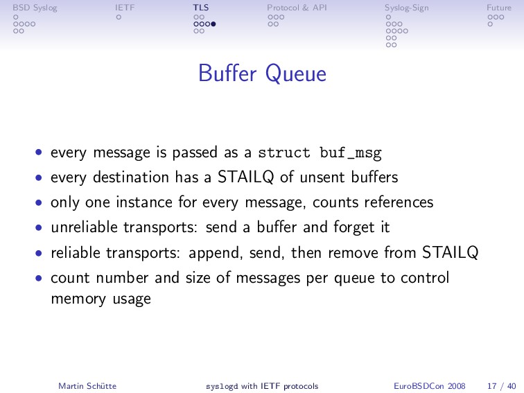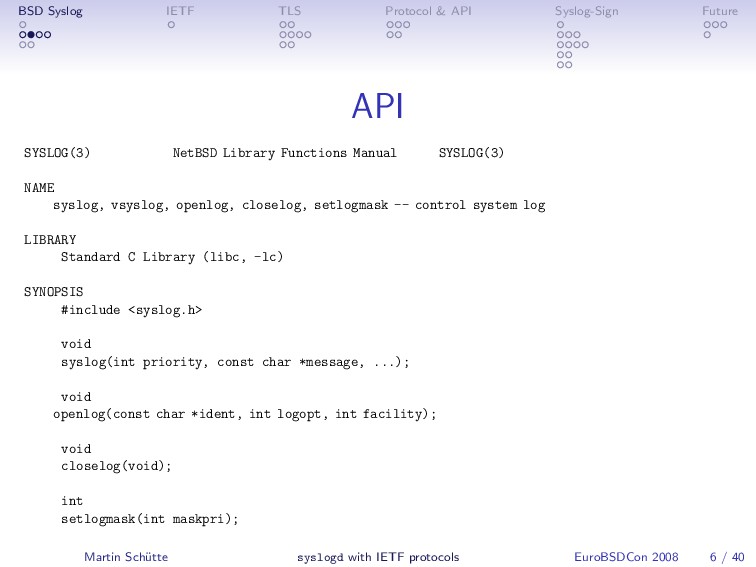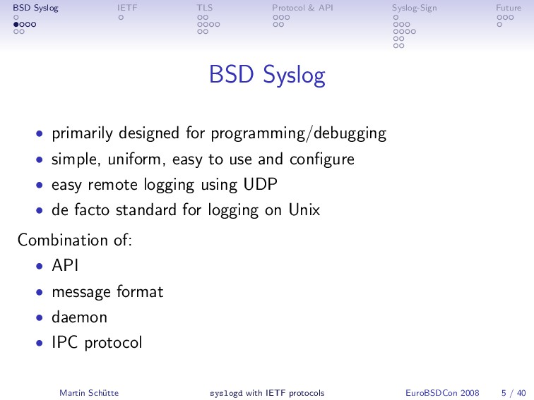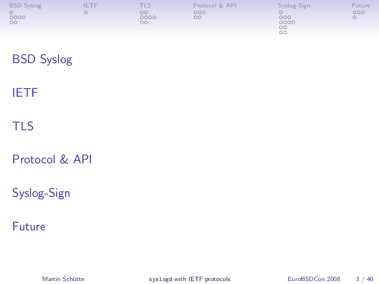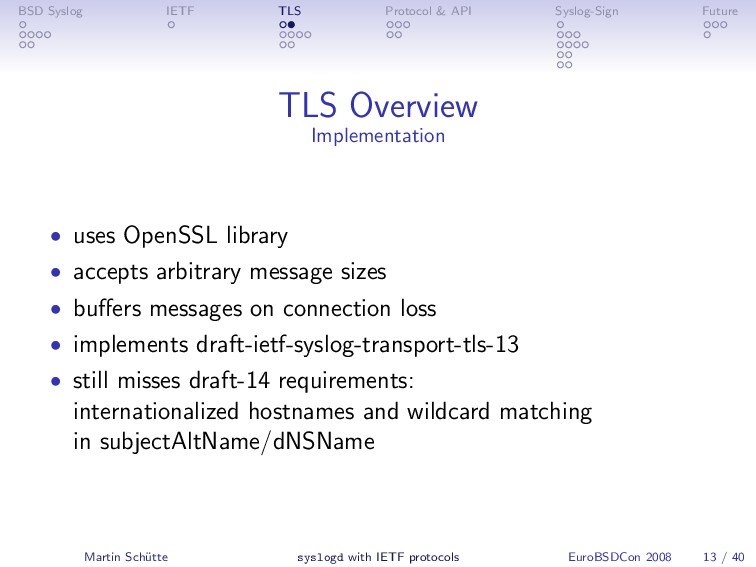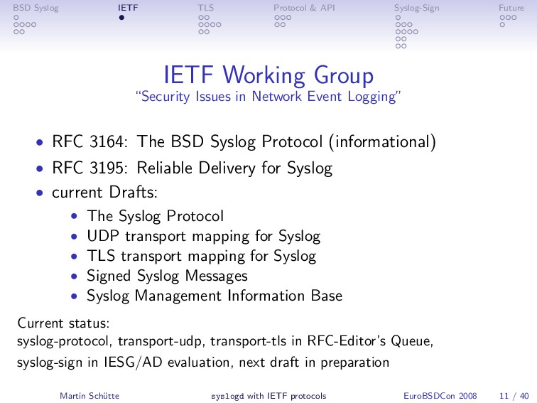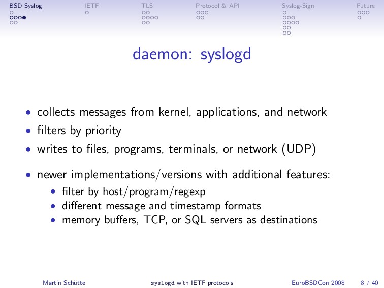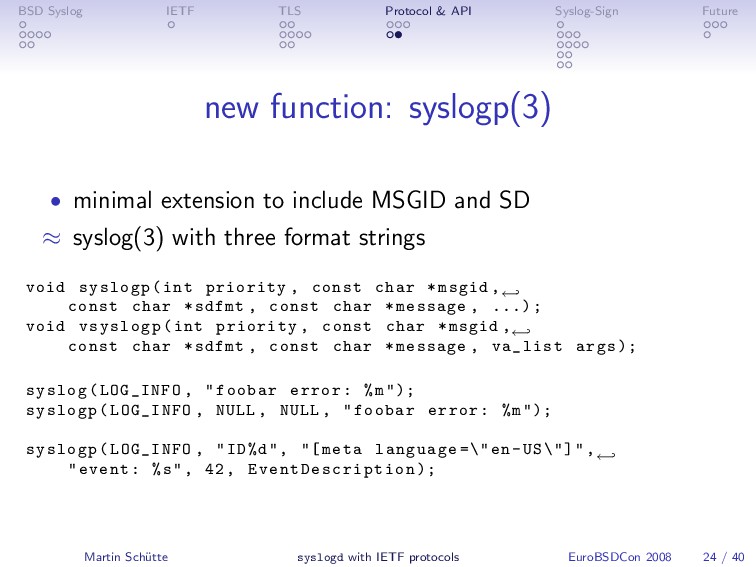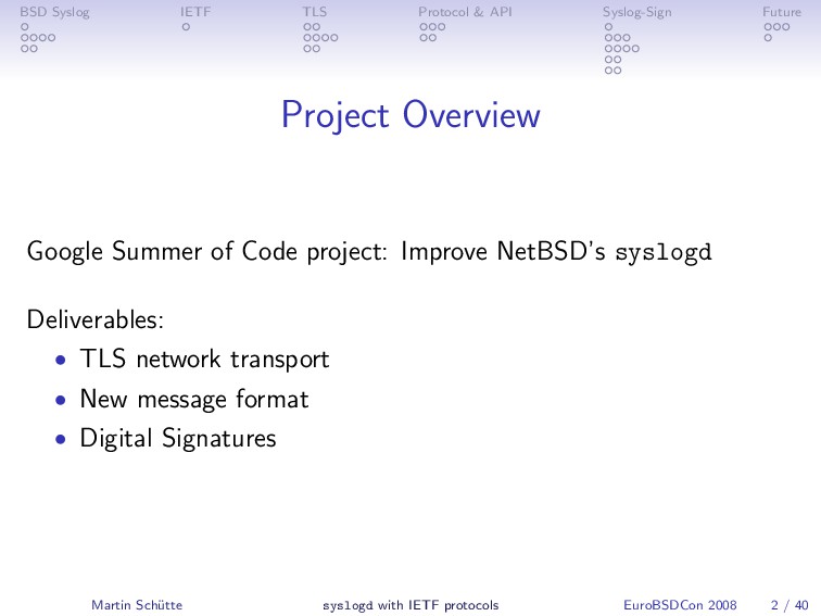 $ perl verify.pl -i test.log reading input ... processing CBs ... decoding SGs ... got PKIX DSA key verifying CBs ... verified CB and got key for SG: (host.example.org ,1217632162 ,0111 ,3 ,0) ,← start: 2008 -08 -02 T01 :09:27.773464+02:00 now process SBs signed messages: ... host.example.org ,1217632162 ,0111 ,3 ,0 ,11 <15>1 ... test 6255 - - msg10 host.example.org ,1217632162 ,0111 ,3 ,0 ,12 <15>1 ... test 6255 - - msg11 host.example.org ,1217632162 ,0111 ,3 ,0 ,13 **** msg lost host.example.org ,1217632162 ,0111 ,3 ,0 ,14 <15>1 ... test 6255 - - msg13 host.example.org ,1217632162 ,0111 ,3 ,0 ,15 <15>1 ... test 6255 - - msg14 host.example.org ,1217632162 ,0111 ,3 ,0 ,16 <15>1 ... test 6255 - - msg15 ... messages without signature: <15>1 2008 -08 -02 T02 :09:27+02:00 host.example.org test 6255 - - modified msg12 Martin Schütte syslogd with IETF protocols EuroBSDCon 2008 36 / 40