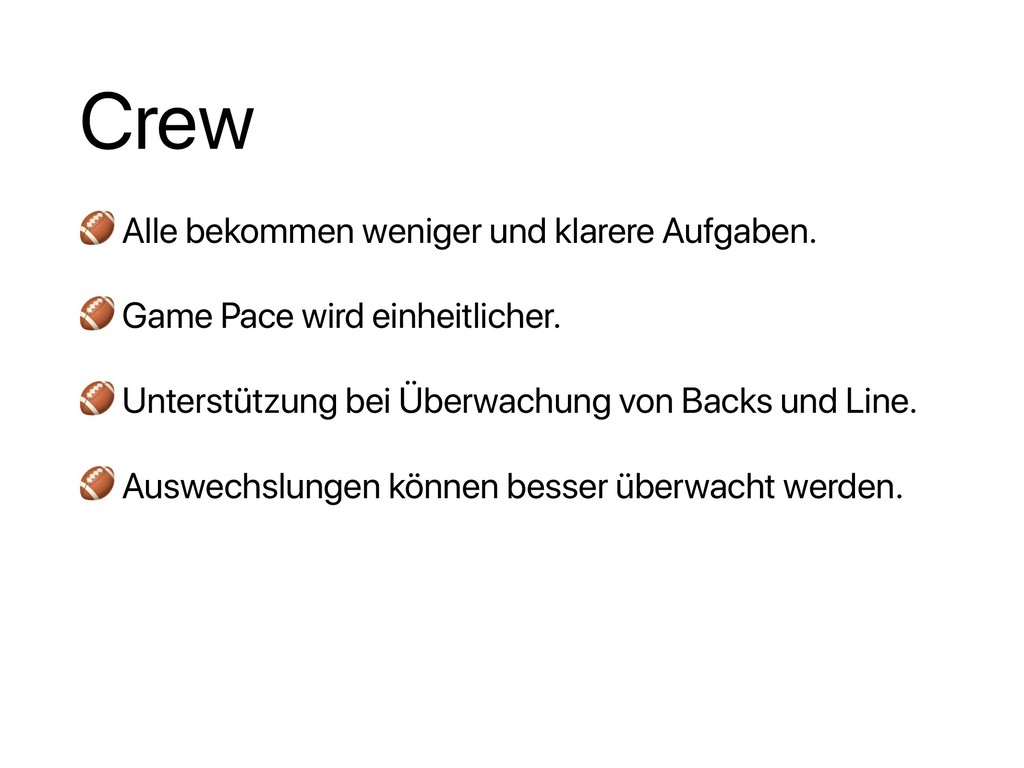 einheitlicher. Unterstützung bei Überwachung von Backs und Line. Auswechslungen können besser überwacht werden.