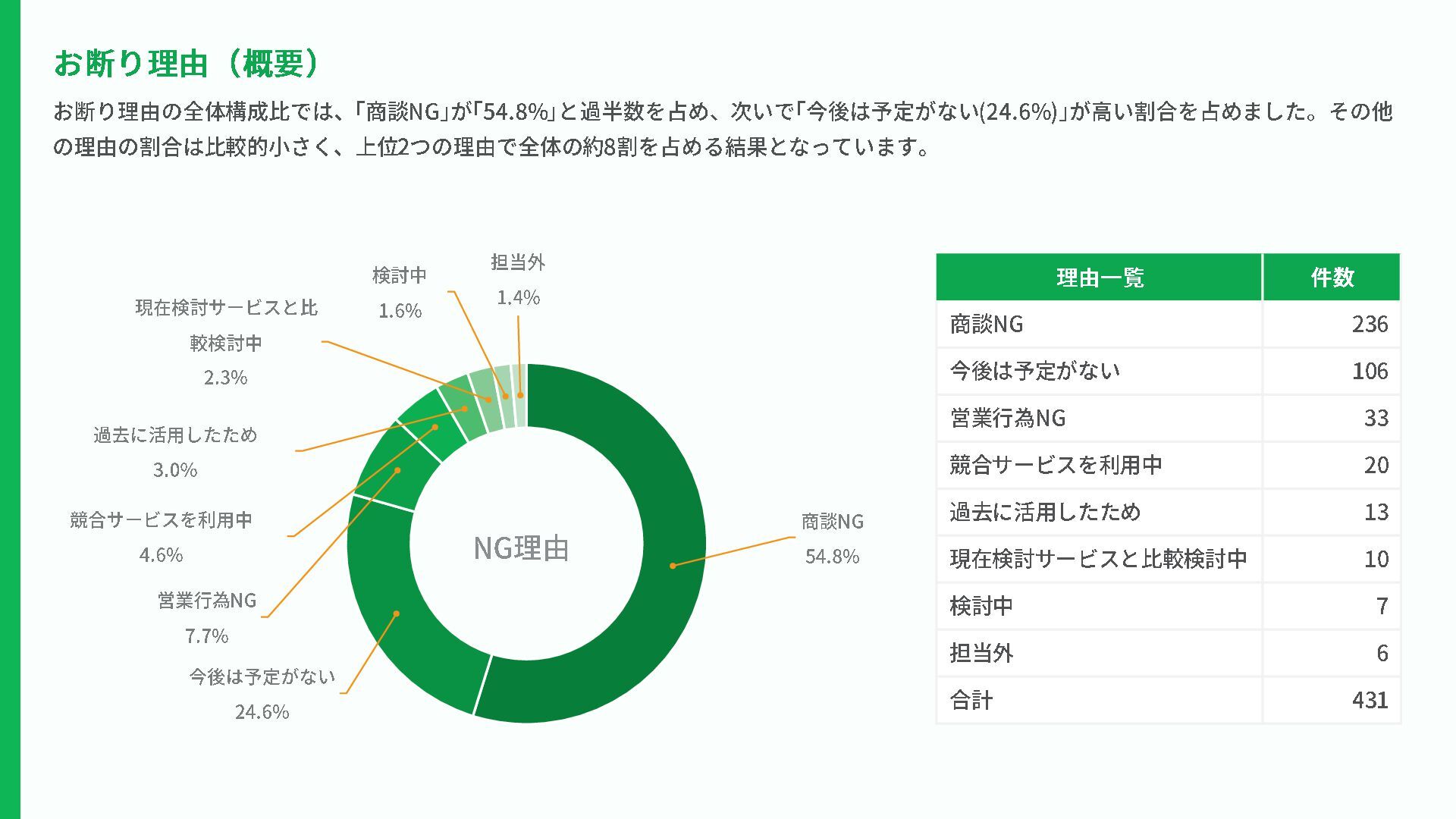 6(1.20%) 31(6.20%) 6(1.20%) 受付:外部依頼のためお断り 10(2.00%) 0(0.00%) 4(0.80%) 0(0.00%) 受付:現状で満足 10(2.00%) 6(1.20%) 6(1.20%) 8(1.60%) 受付:新規提案お断り 20(4.00%) 1(0.20%) 8(1.60%) 3(0.60%) 担当:興味ない 1(0.20%) 32(6.40%) 53(10.60%) 34(6.80%) 担当:現状で満足 0(0.00%) 21(4.20%) 11(2.20%) 34(6.80%) 担当:他社導入済み 1(0.20%) 17(3.40%) 22(4.40%) 18(3.60%) 担当:予算がない 0(0.00%) 0(0.00%) 3(0.60%) 0(0.00%) 担当:理由無しのお断り 0(0.00%) 0(0.00%) 7(1.40%) 4(0.80%)