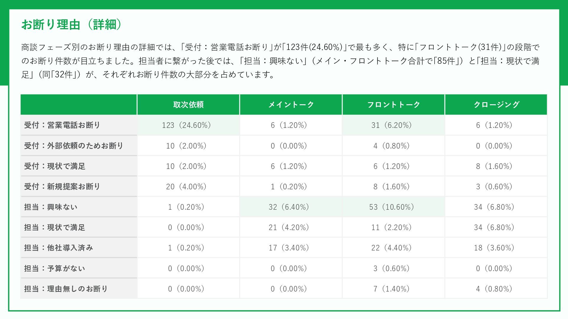 商談フェーズ別のお断り理由の詳細では、「受付:営業電話お断り」が「123件(24.60%)」で最も多く、特に「フロントトーク(31件)」の段階で のお断り件数が目立ちました。担当者に繋がった後では、「担当:興味ない」(メイン・フロントトーク合計で「85件」)と「担当:現状で満 足」(同「32件」)が、それぞれお断り件数の大部分を占めています。 お断り理由(詳細) 取次依頼 メイントーク フロントトーク クロージング 受付:営業電話お断り 123(24.60%)