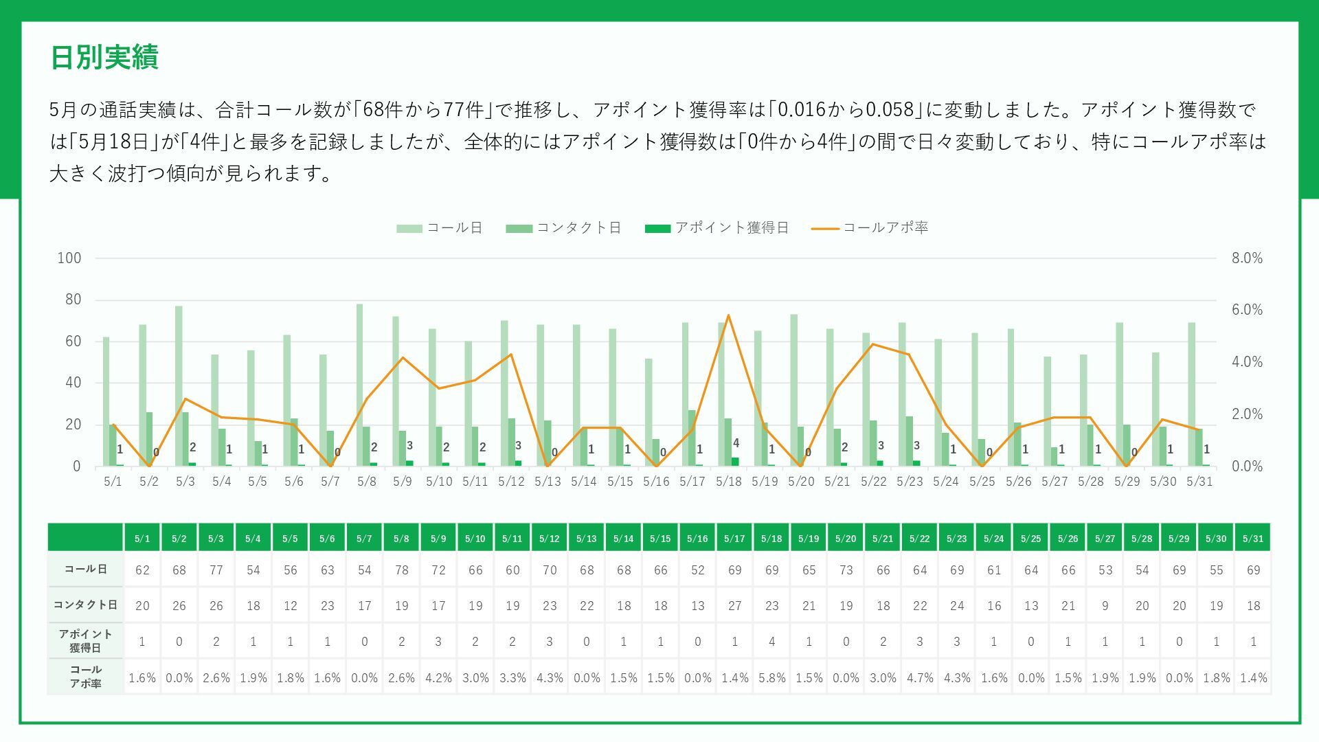 5月の通話実績は、合計コール数が「68件から77件」で推移し、アポイント獲得率は「0.016から0.058」に変動しました。アポイント獲得数で は「5月18日」が「4件」と最多を記録しましたが、全体的にはアポイント獲得数は「0件から4件」の間で日々変動しており、特にコールアポ率は 大きく波打つ傾向が見られます。 日別実績 5/1 5/2 5/3 5/4 5/5 5/6